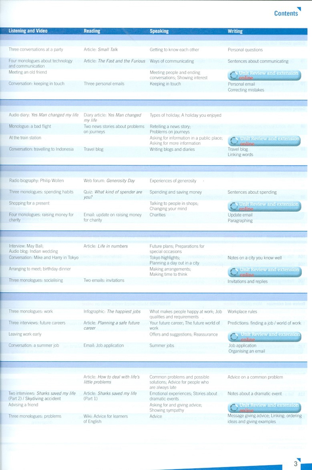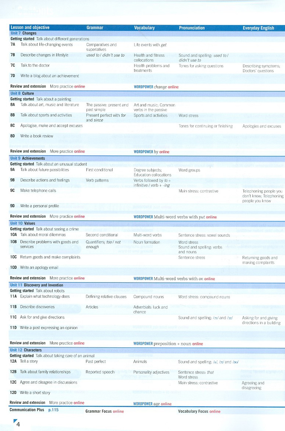 Unit 1. Communicting Unit 2. Travel and Tourism Unit 3. Money Unit 4. Social Life Unit 5. Work Unit 6. Problems and Advice Unit 7. Changes Unit 8. Culture Unit 9. Achievements Unit 10. Values Unit 11. Discovery and Invention Unit 12. Characters