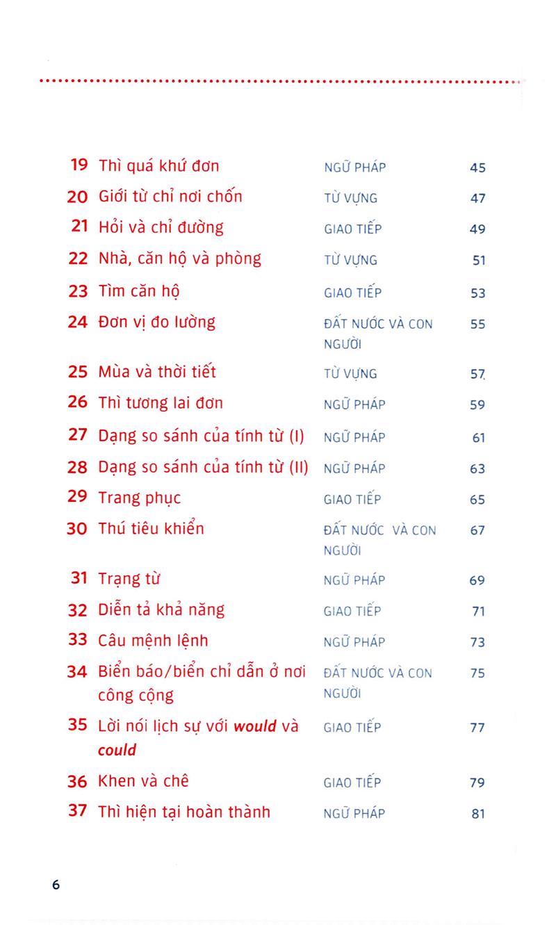 Sách có tổng cộng 71 bài và tập trung vào những chủ đề quan trọng nhất nhằm giúp bạn ôn tập từ vựng tiếng Anh cùng kiến thức về ngữ pháp cơ bản, thực hành giao tiếp, đồng thời hiểu thêm về đất nước và con người của các nước nói tiếng Anh.