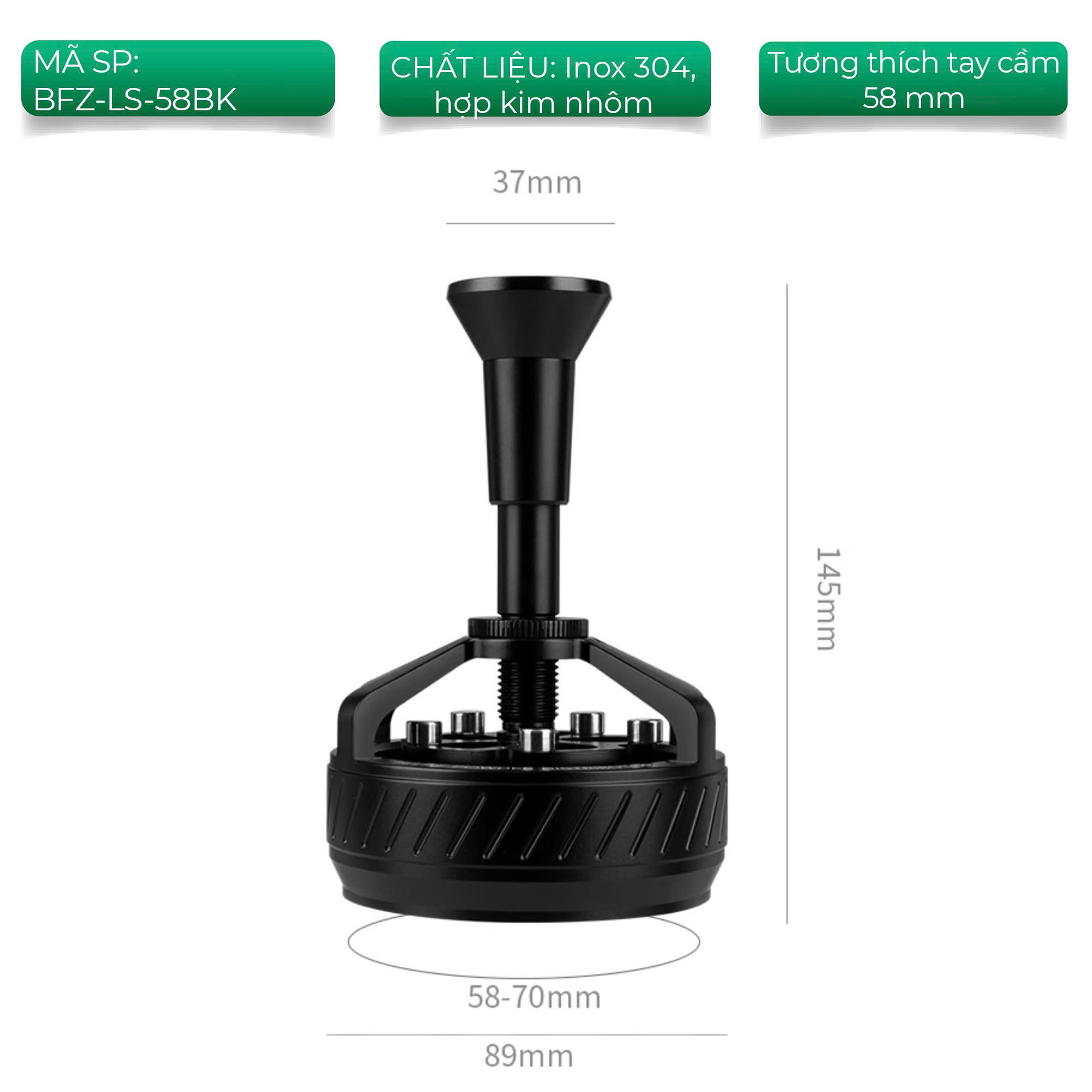 ƯU ĐIỂM NỔI BẬT CỦA SẢN PHẨM ️ Công nghệ xoắn ốc tự động xoay – Tán bột nhanh. Khi nhấn xuống, trục tự động xoay theo đường ren, giúp 14 kim phân phối bột đồng đều, tránh tình trạng bột vón cục. ️ Hệ thống 14 kim inox 304 siêu mảnh, dày 0,25mm sắp xếp theo 14 vòng tròn đồng tâm, giúp phân bổ bột tối ưu, hạn chế kênh rãnh (channeling). ️ Khoảng cách giữa các rãnh trộn: 2,2mm, phạm vi trộn tối đa: 55mm. ️ Điều chỉnh độ sâu kim linh hoạt (18 - 22mm). Xoay ngược chiều kim đồng hồ để tăng độ sâu, xoay cùng chiều để giảm. ️ Đế từ tính siêu chắc với 10 nam châm phân bổ đều, giúp cố định chắc chắn trên tay cầm 58mm, đảm bảo thao tác chính xác. ️ Thiết kế tích hợp – Không cần đế bảo quản. Kim tán được thu gọn bên trong, giúp bảo vệ sạch sẽ, không tiếp xúc với mặt bàn khi không sử dụng.