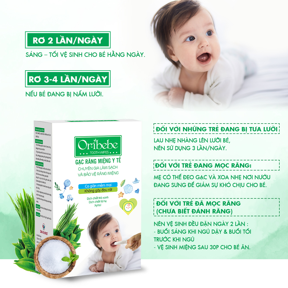 Gạc răng miệng y tế Oribebe được xem là một trong những “trợ thủ đắc lực” để làm sạch lưỡi, nướu và răng miệng cho bé yêu nhà bạn. Không chỉ dừng lại ở khả năng làm sạch cực tốt hay ngăn ngừa các bệnh lý về răng miệng mà gạc răng miệng y tế Oribebe còn mang lại cảm giác nhẹ nhàng và an toàn cho bé, mẹ chẳng lo ngại bé khóc quấy hay khó chịu trong mỗi lần sử dụng.