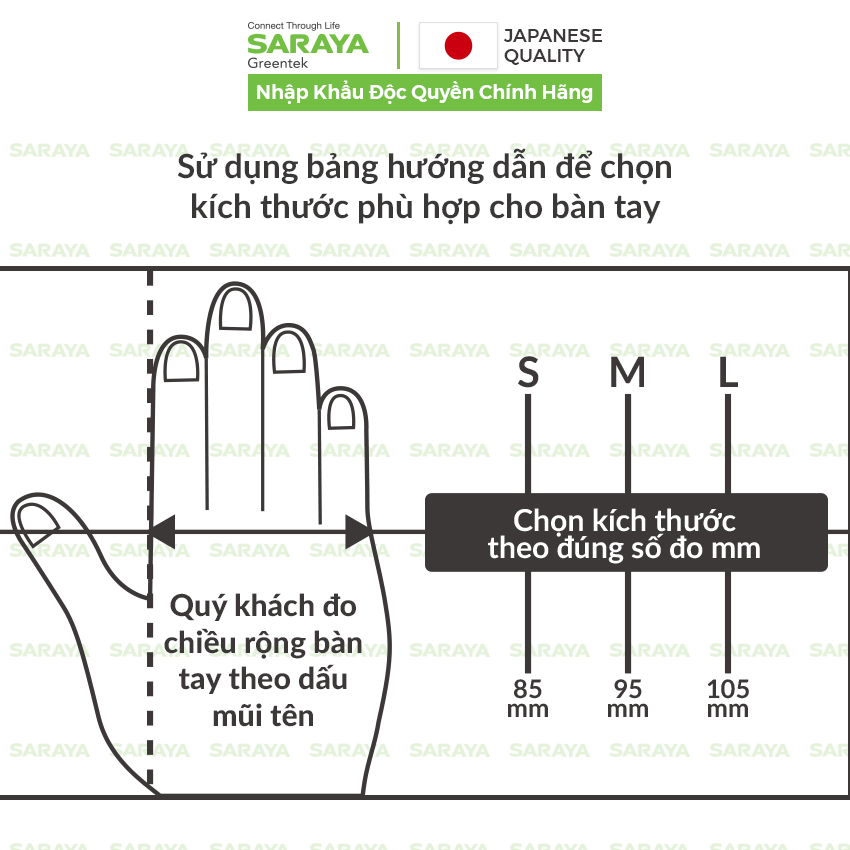 Thương hiệu: SARAYA. Xuất xứ thương hiệu: NHẬT BẢN. Xuất xứ: Trung Quốc. Quy cách đóng gói: 100 cái/ hộp, 10 hộp/ thùng. Đặc tính & công dụng sản phẩm: Dày, Không mùi, Không bột, Không chứa Latex. Hướng dẫn sử dụng: - Chế biến thực phẩm. - Công nghiệp điện tử. - Vệ sinh nhà cửa. - Spa và làm đẹp. - Vệ sinh y tế. - Vệ sinh công cộng - Dùng một lần, có thể sử dụng cho cả 2 tay (tay trái và tay phải). Hướng dẫn bảo quản: Nơi khô ráo, thoáng mát tránh ánh sáng mặt trời trực tiếp, ánh sáng đèn huỳnh quang, tia X, hơi ẩm hoặc ozone. Tránh bảo quản ở nhiệt độ trên 60 độ C.