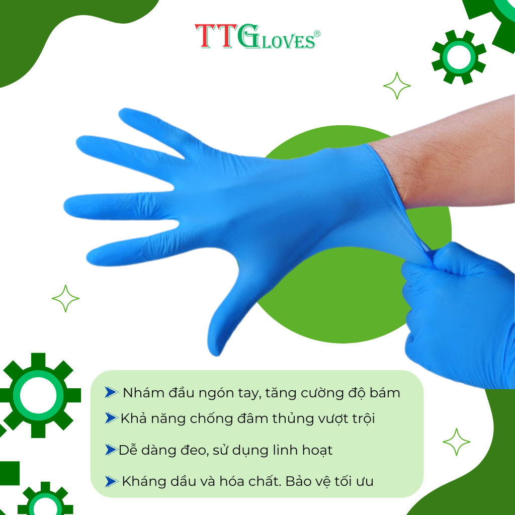 Găng Tay Cao Su Nitrile Không Bột TTGloves Màu Xanh, Dai Hơn, Bền Hơn, Khó Rách Hơn