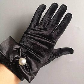 Găng tay Cô dâu và Dạ hội, đi tiệc, sự kiện. MS: 45451. Chất liệu: nhung, co giãn. Kiểu dáng: bao kín ngón, ôm tay, đính nơ và ngọc trai. Hoạ tiết: trơn. Độ dài: