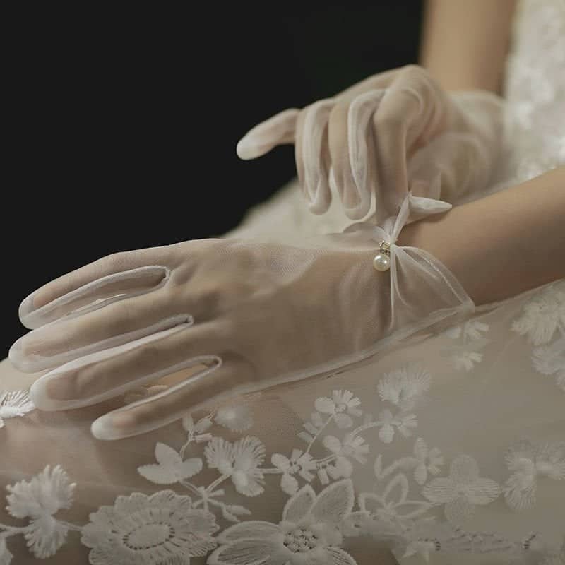 Găng tay Cô dâu và Dạ hội, đi tiệc, sự kiện, lễ hội, chụp ảnh MS: 43445 Chất liệu: tuyn mềm. Kiểu dáng: bao kín ngón, trong suốt, tạo kiểu và đính hạt trai ở
