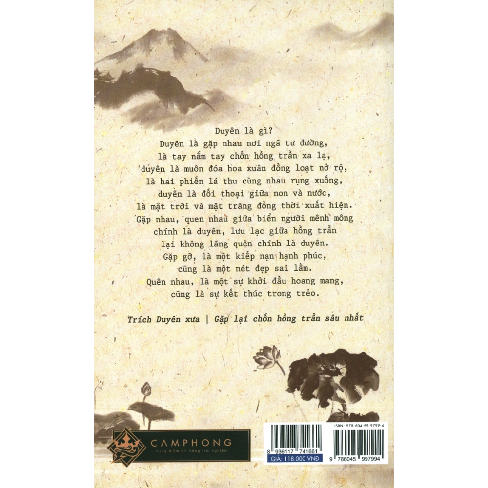 Mua tại TiktokGặp Lại Chốn Hồng Trần Sâu Nhất (Tái Bản) "Duyên là gì? Duyên là gặp nhau nơi ngã tư đường, là nắm tay chốn hồng trần xa lạ; duyên là muôn đóa hoa xuân đồng loạt nở rộ, là hai phiến lá thu cùng nhau rụng xuống; duyên là đối thoại giữa non và nước, là mặt trời và mặt trăng đồng thời xuất hiện. Gặp nhau, quen nhau giữa biển người mênh mông chính là duyên, lưu lạc giữa hồng trần lại không lãng quên chính là duyên. Gặp gỡ, là một kiếp nạn hạnh phúc, cũng là một nét đẹp sai lầm. Quên nhau, là một sự khởi đầu hoang mang, cũng là sự kết thúc trong trẻo." (Trích Duyên xưa)