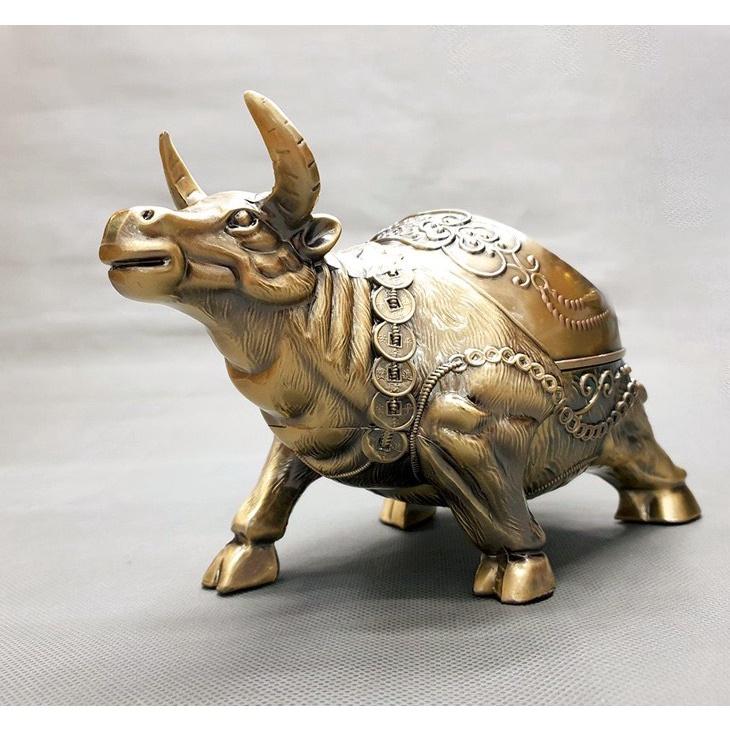 ên sản phẩm : Gạt tàn Trâu đồng Kích thước sản phẩm: 10cm×13cm×21cm Chất liệu: Hợp kim kẽm Trọng lượng sản phẩm: 500 GRAM Màu sắc: Đồng Giả Cổ và Trắng Vàng Tính năng: -