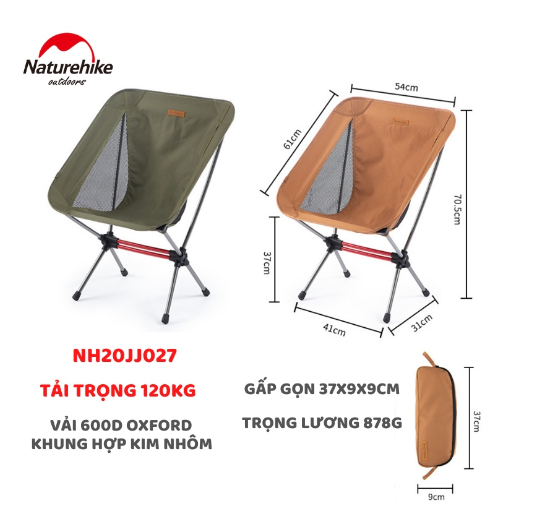 GHẾ DÃ NGOẠI GẤP GỌN YL08 NATUREHIKE NH20JJ027 THÔNG TIN SẢN PHẨM: - Thương hiệu: NatureHike - Tên sản phẩm: Ghế dã ngoại gấp gọn YL08 NatureHike NH20JJ027 - Mã sản phẩm: NH20JJ027 - Chất liệu: vải 600D Vải Oxford, khung hợp kim nhôm - Kích thước: 413171cm - Kích Thước gấp gọn: 379cm - Trọng lượng: 878g - Tải trọng: 120kg - Phù hợp cho hoạt động cắm trại, dã ngoại, câu cá, sân vườ - Màu sắc: Xanh rêu, Nâu sáng - Bao gồm: Ghế, 01 bộ 4 bọc chân ghế loại lớn và túi đựng - Xuất xứ: Trung Quốc