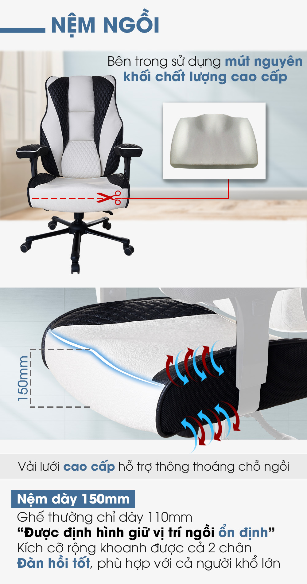 Đặc điểm nổi bật Thiết kế công thái học: hỗ trợ cột sống, giảm đau mỏi lưng – cổ khi ngồi lâu. Lưng lưới thoáng khí: ngồi thoải mái, không nóng lưng. Đệm mút bọc