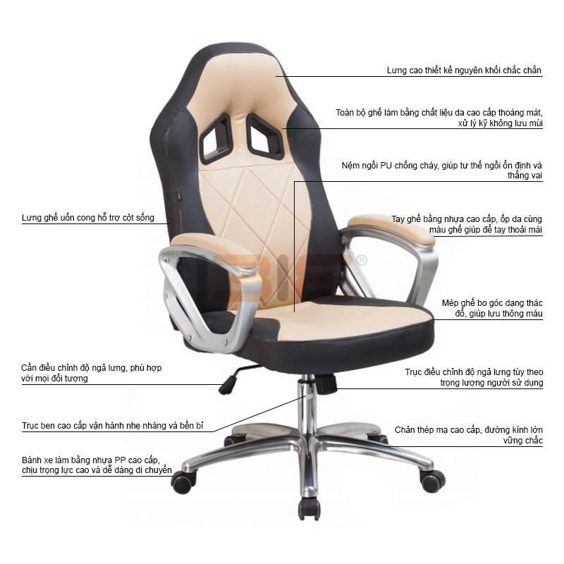 Đặc điểm nổi bật Thiết kế công thái học: hỗ trợ cột sống, giảm đau mỏi lưng – cổ khi ngồi lâu. Lưng lưới thoáng khí: ngồi thoải mái, không nóng lưng. Đệm mút bọc
