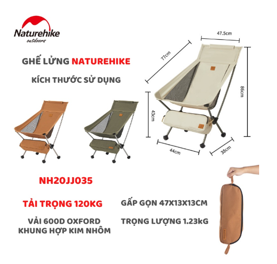 MÔ TẢ SẢN PHẨM THÔNG TIN SẢN PHẨM - Thương hiệu: NatureHike - Mã sản phẩm: NH17T003-Y - Chất liệu: Vải offord 600D, nhôm, gỗ - Tải trọng tối đa: 120kg - Kích thước sử