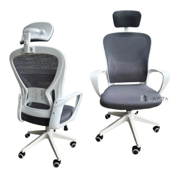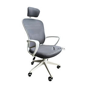 - Chất liệu: Lưng lưới cao, có tựa đầu, nệm vải, khung và thân ghế, bánh xe màu trắng. Ghế xoay, nâng hạ.