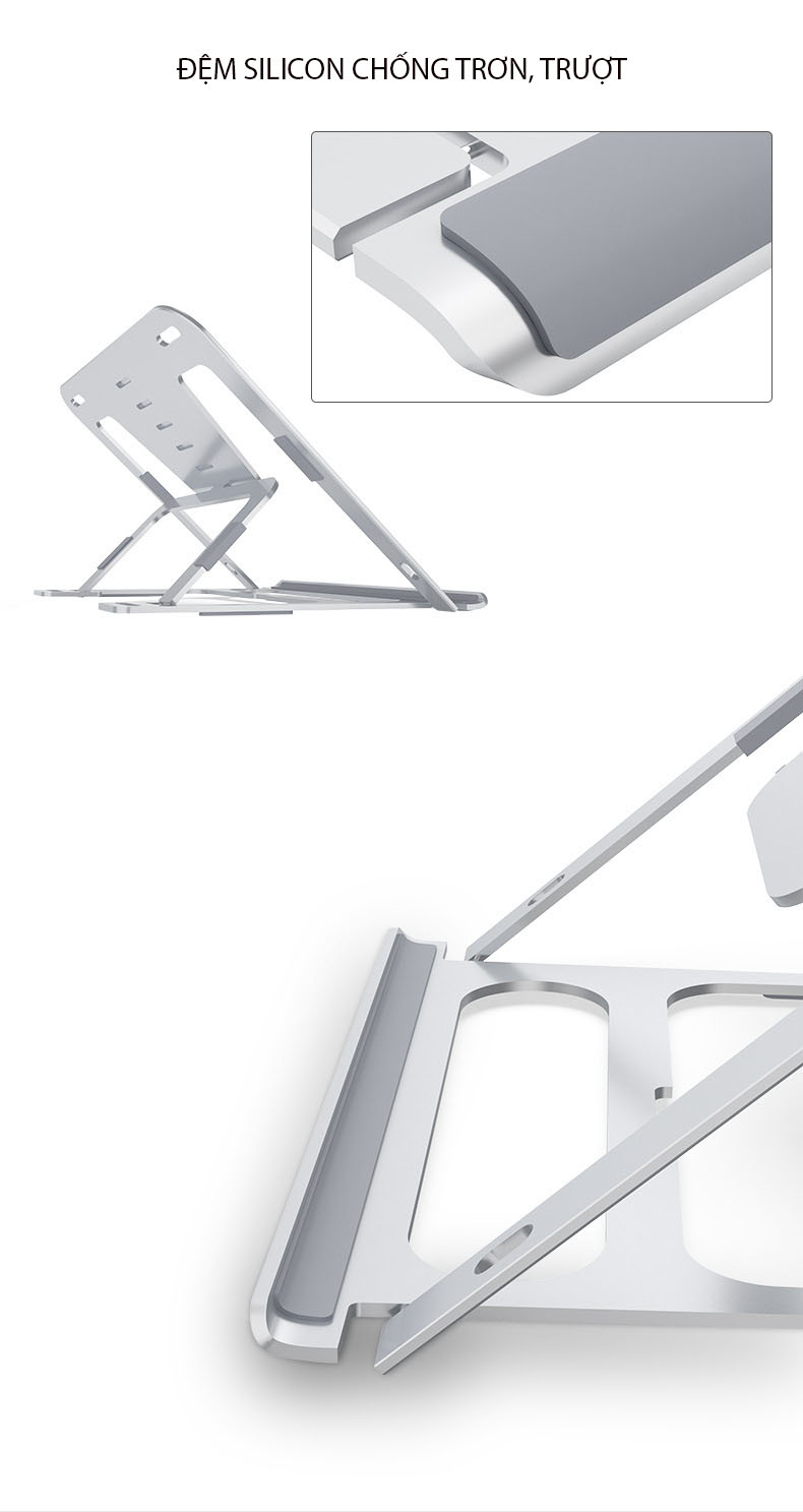 - Chất liệu hợp kim nhôm không gỉ, siêu vững, không gây kích ứng da - Thiết kế siêu mỏng, gọn, nhẹ, dán luôn ở mặt đáy của laptop, khi sử dụng chỉ cần gạt
