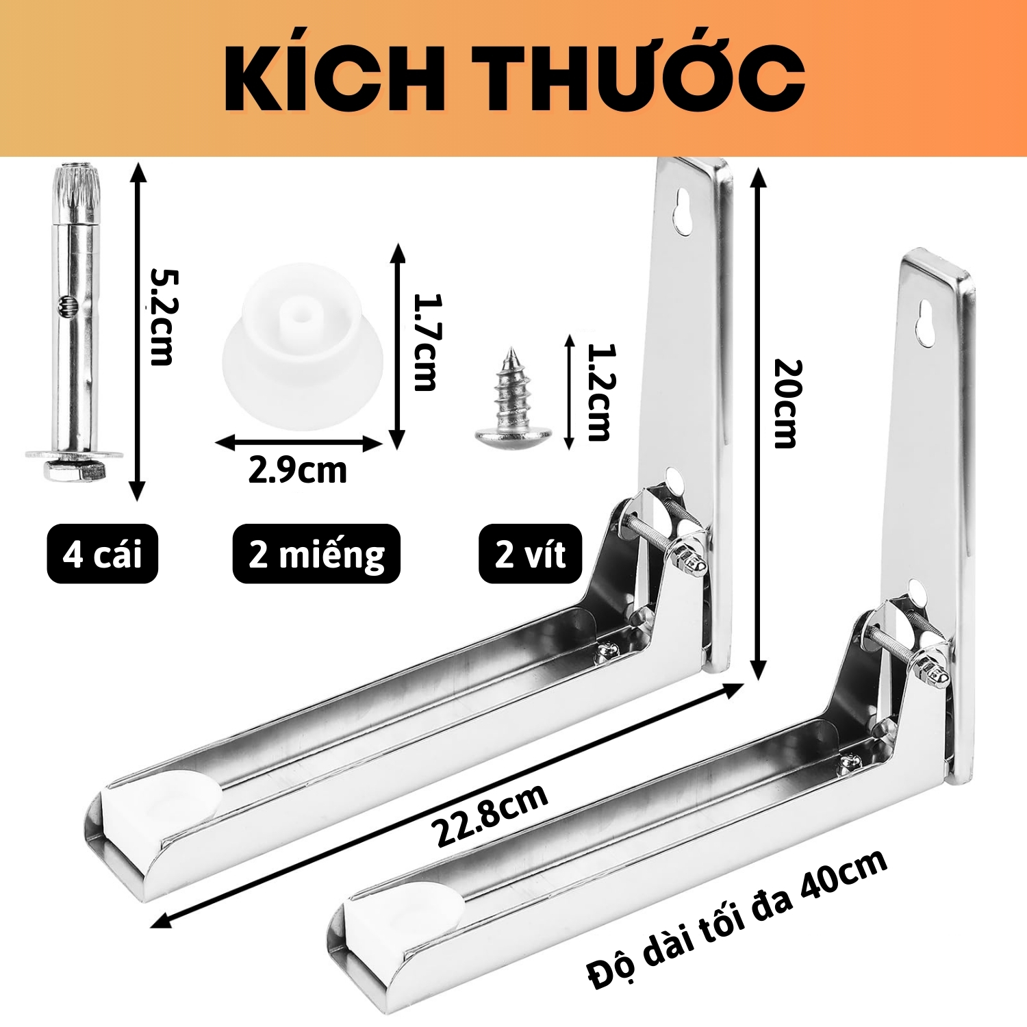 - Bộ sản phẩm gồm: 1 cặp giá đỡ, 4 tắc kê lỗ sắt, 2 vít, 2 miếng đệm nhựa. ƯU ĐIỂM