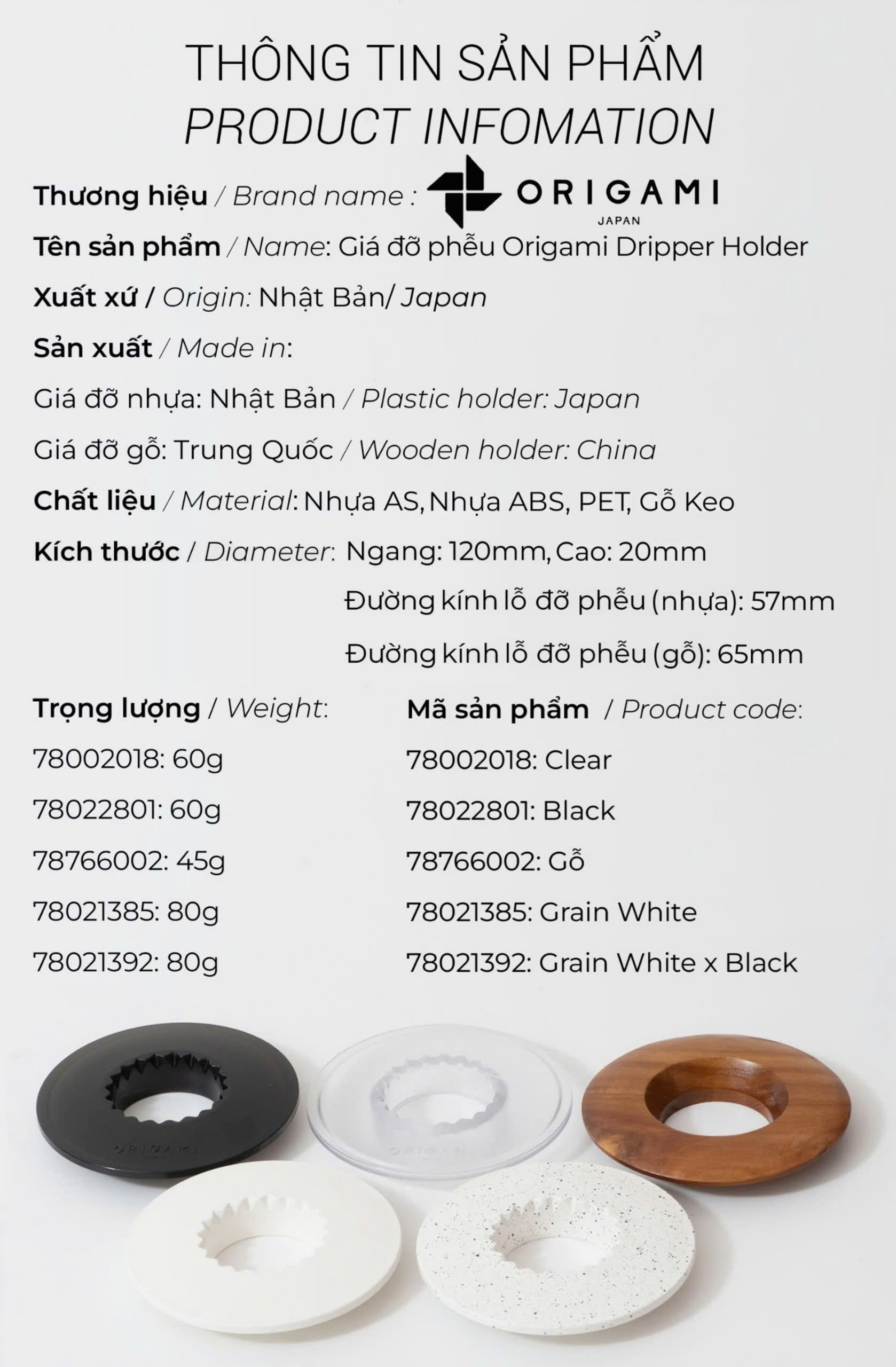 - Có tạo rãnh khớp với phễu: Tăng cường độ cân bằng của phễu khi pha cà phê (Khác với đế gỗ Origami không có rãnh) THÔNG TIN KỸ THUẬT ĐẾ NHỰA ORIGAMI CHÍNH HÃNG Thương hiệu: Chất liệu: Nhựa AS Resin Kích thước: Đường kính ngoài: 120mm – Đường kính lỗ trong: 50mm – Dày 20mm Trọng lượng: 35g NOTE: Sản phẩm không tương thích sử dụng với máy rửa chén. Với sản phẩm đế đỡ gỗ, bạn nên sử dụng bọt biển hoặc khăn mềm thay vì bàn chải/cọ cứng để vệ sinh. Không nên làm sạch bằng cách ngâm nước hoặc nước nóng. Sau khi làm sạch, hãy chú ý lau khô và bảo quản đế ở nơi khô thoáng bạn nhé!
