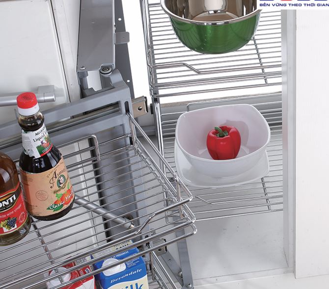 Giá đa năng để giao thớt, chai lọ, gia vị Chất liệu: Inox 304 dạng nan tròn Phiên bản bắt cánh ngăn kéo và mở cánh Ray âm giảm chấn Angas Độ rộng cánh: 300mm