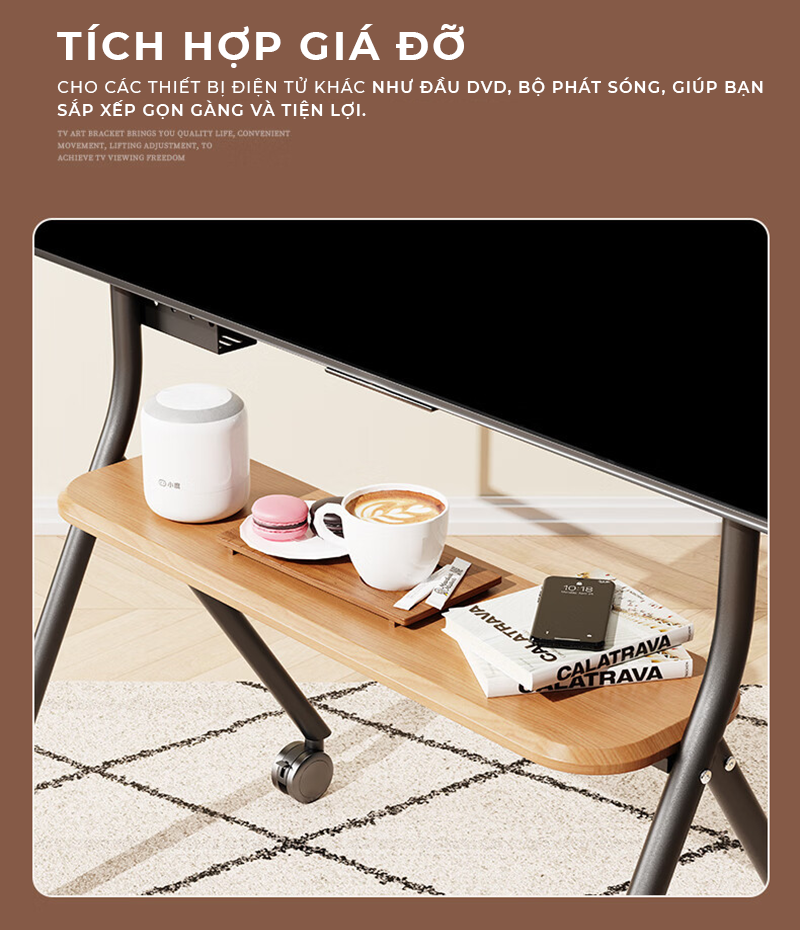 Công năng: Là mẫu giá treo tivi di động kèm kệ để đồ tiện lợi phù hợp nhiều không gian như phòng khách, phòng ngủ, phòng họp, phòng cộng đồng, ..