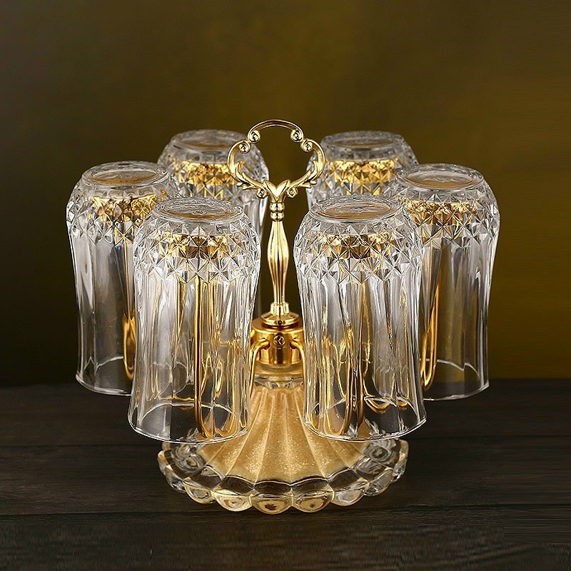 Chất liệu: thủy tinh Bộ sản phẩm gồm: 6 cốc thủy viền vàng VÀ GIÁ ÚP CỐC THEO HÌNH Thiết kế đẹp mắt, phù hợp tiện dụng Độ bền cao, chịu nhiệt tốt, hạn chế