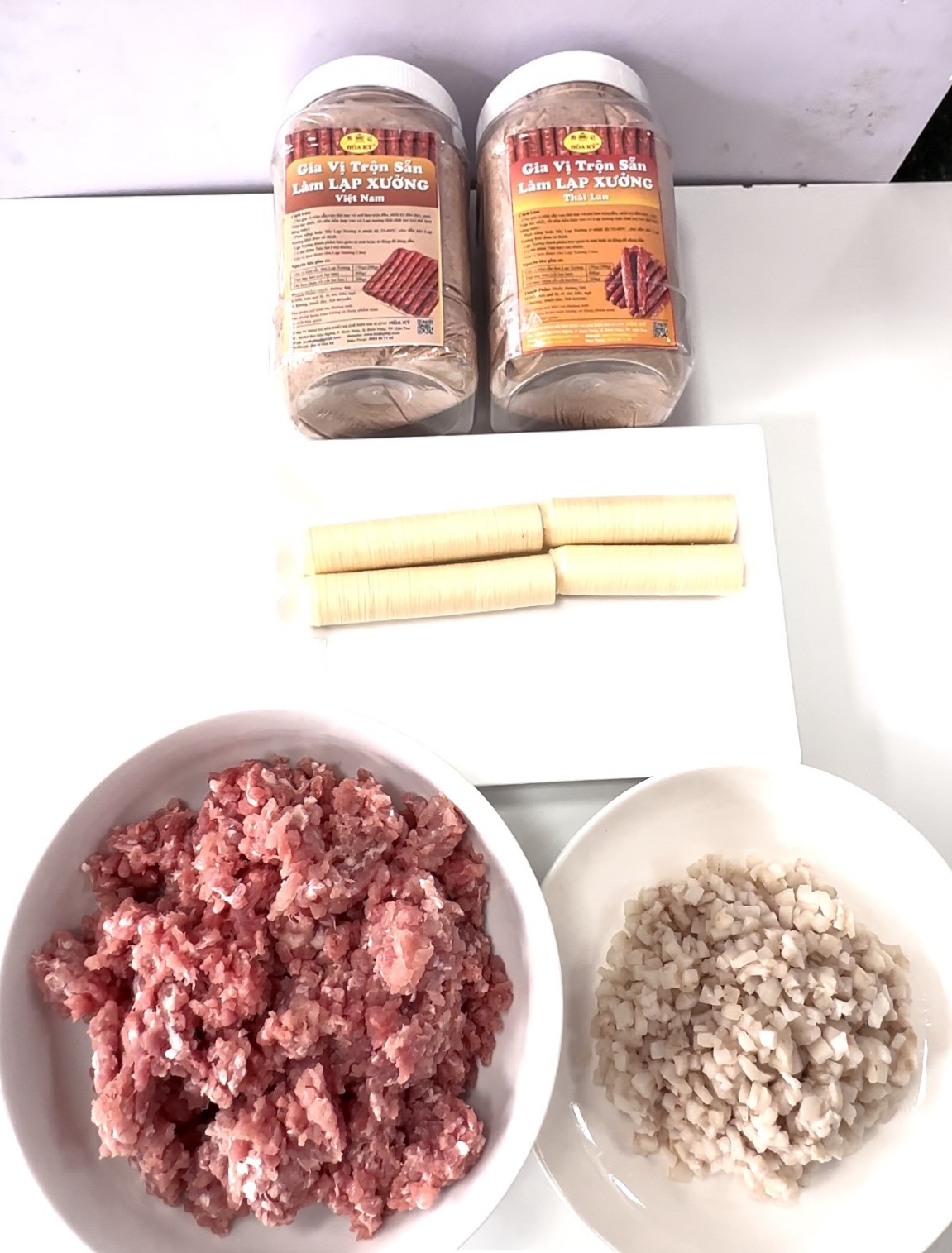 Nguyên liệu gồm có : - Gia vị trộn sẵn làm Lạp Xưởng: 150gr- 200gr. -Thịt nạc heo ( cắt hạt lựu ) 800gr -Mỡ heo (luộc rồi cắt hạt lựu )200gr Tiêu