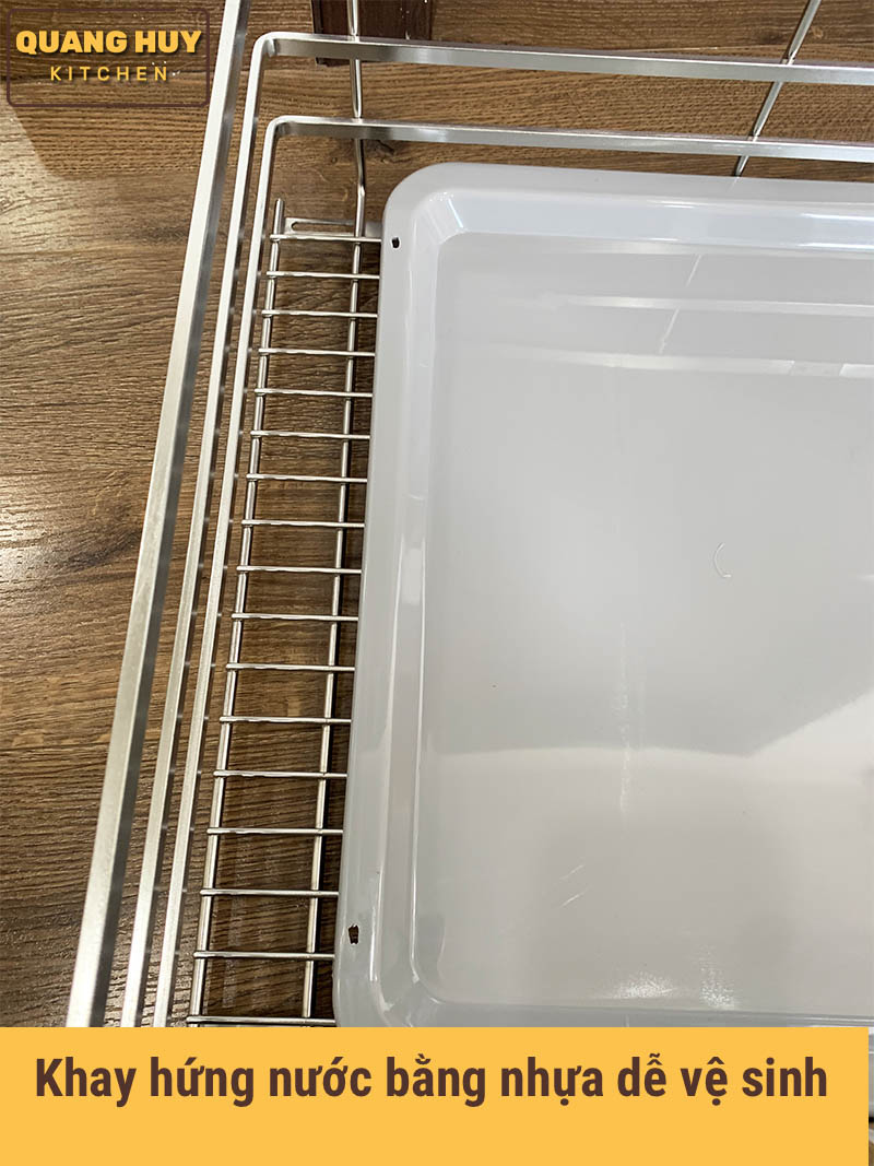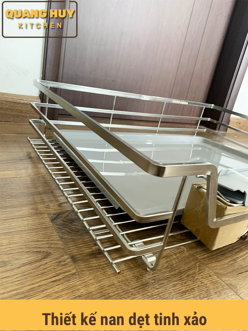 - Những ưu điểm của giá xoong nồi tủ bếp dưới inox 304 3.1. Cấu tạo của giá xoong nồi nan dẹt tủ bếp dưới inox 304 gồm Giá xoong nồi chất liệu inox 304 thiết kế nan dẹt Khay hứng nước 2 ray giảm chấn đi kèm để bắt bên hông Gắn cánh để khách hàng có thể lắp trực tiếp vào cánh tủ Ốc bắt vít Ốp ray giảm chấn đi kèm Cấu tạo của giá xoong nồi inox 304 nan dẹt 3.2. Chất liệu inox 304 bảo hành vĩnh viễn han gỉ Khác so với các sản phẩm khác thì giá xoong nồi inox 304 Grob này đã đạt tiêu chuẩn kiểm định của tổng cục đo lường chất lượng về chất liệu inox 304. Bạn có thể xem ở phía dưới có kết quả thử nghiệm Kết quả thử nghiệm chuẩn inox 304 được tổng cục tiêu chuẩn đo lường chất lượng kiểm định Kết quả thử nghiệminox 304 đi kèm với giá xoong nồi Logo SUS304 dập trên sản phẩm để phân biệt với các thương hiệu khác cũng như phân biệt chất liệu inox 304 Hình ảnh thực tế giá xoong nồi nan dẹt Trên sản phẩm có dán tem chống hàng giả và tem bảo hành của sản phẩm. Sản phẩm giá xoong nồi này được bảo hàng điện tử khi nhận hàng quý khách hàng chỉ cần cào tem và quét mã vạch sau đó điền thông tin vào form để kích hoạt bảo hành 3.3. Dễ dàng kết hợp với giá úp bát đĩa tủ dưới Bạn có thể kết hợp giá xoong nồi ở tầng dưới và giá úp bát ở trên như hình bên dưới đều được Hoặc bạn có thể lắp 2 tầng giá xoong nồi đều được tuỳ vào nhu cầu của khách hàng. Giá bán trên là 1 tầng. Bạn đặt hàng đặt lên số lượng là 2 sẽ là 2 tầng Kết hợp giá xoong nồi và giá úp bát cho tủ bếp dưới Hoặc bạn có thể lắp 2 tầng để tăng diện tích sử dụng. Lưu ý giá bán là 1 bộ/ 1 tầng Hình ảnh anh Hải Thanh Xuân mua hàng tại Quang Huy Kitchen, anh Hải có kết hợp giá xoong nồi và giá úp bát với nhau Hình ảnh thùng hàng giá xoong nồi inox 304 nan dẹt mã GB304-70 3.4. Thiết kế nan dẹt tinh tế Sản phẩm được thiết kế nan dẹt tinh tế và sang trọng nên có giá thành đắt hơn các sản phẩm có thiết kế nan tròn dù là cùng chất liệu Sản phẩm được thiết kế nan dẹt tinh xảo Các nan chắc chắn và đẹp mắt, khả năng chịu lực tốt Hình ảnh chụp gần thiết kế nan 3.5. Ray giảm chấn cao cấp và ốp ray đi kèm Ray giảm chấn là phụ kiện rất quan trọng với 1 giá xoong nồi. Độ bền của giá xoong nồi có tốt hay không phụ thuộc rất nhiều vào ray giảm chấn. Ray giảm chấn của giá xoong nồi có khả năng chịu lực lên đến 50kg dù bạn úp nhiều cũng không làm kẹt ray Ray có khả năng chịu lực tốt Ray giảm chấn hoạt động êm ái, đóng mở nhẹ nhàng, sau 1 thời gian sử dụng vẫn hoạt động tốt, độ bền cao Ngoài ra giá còn có ốp ray đi kèm để bảo vệ ray khỏi nước giúp ray được bền hơn. Đây là sự nâng cấp mà không phải giá xoong nồi nào cũng có Khay hứng nước bằng nhựa rất dễ dàng vệ sinh và tháo rời