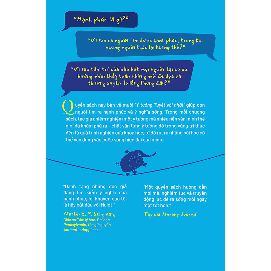 Mua tại Tiktok“Hạnh phúc là gì?” “Vì sao có người tìm được hạnh phúc, trong khi những người khác lại không thể?” “Vì sao tâm trí của hầu hết mọi người lại có xu hướng nhìn thấy toàn những mối đe dọa và thường xuyên lo lắng không đâu?” Quyển sách này bàn về “10 Ý Tưởng Tuyệt Vời Nhất” giúp con người tìm ra hạnh phúc và ý nghĩa sống. Trong mỗi chương sách, tác giả chiêm nghiệm một ý tưởng mà nhiều nền văn minh thế giới đã khám phá ra – chất vấn từng ý tưởng đó trong vùng tri thức đến từ quá trình nghiên cứu khoa học, từ đó rút ra những bài học có thể vận dụng vào cuộc sống hiện đại của mình. …… Hạnh phúc đến từ bên trong, và hạnh phúc cũng đến từ bên ngoài. Chúng ta cần sự dẫn dắt từ cả trí tuệ cổ đại lẫn khoa học hiện đại để có được sự cân bằng đúng đắn. “Ai cũng đã nghe qua “điều gì không giết được ta sẽ càng khiến ta mạnh mẽ hơn”, nhưng đó là một sự khái quát thái quá và nguy hiểm. Có rất nhiều thứ không giết chết bạn nhưng sẽ gây tổn hại cho bạn cả đời. Tại sao một số người tìm được ý nghĩa, mục đích, và sự viên mãn trong cuộc sống, còn những người khác lại không? Tôi cũng sẽ bàn đến việc mọi người thực chất muốn nói điều gì khi họ đặt ra câu hỏi: “Ý nghĩa cuộc sống là gì?”, và tôi sẽ đưa ra câu trả lời cho câu hỏi đó.” (Tác giả Jonathan Haidt)