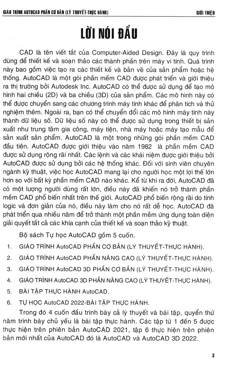 Trong đó 4 cuốn đầu trình bày cả lý thuyết và bài tập, quyển thứ năm trình bày chủ yếu là bài tập thực hành. Các tập từ 1 đến 5 được thực hiện trên phiên bản AutoCAD 2021, tập 6 thực hiện trên phiên bản mới nhất của AutoCAD đó là AutoCAD và AutoCAD 3D 2022.