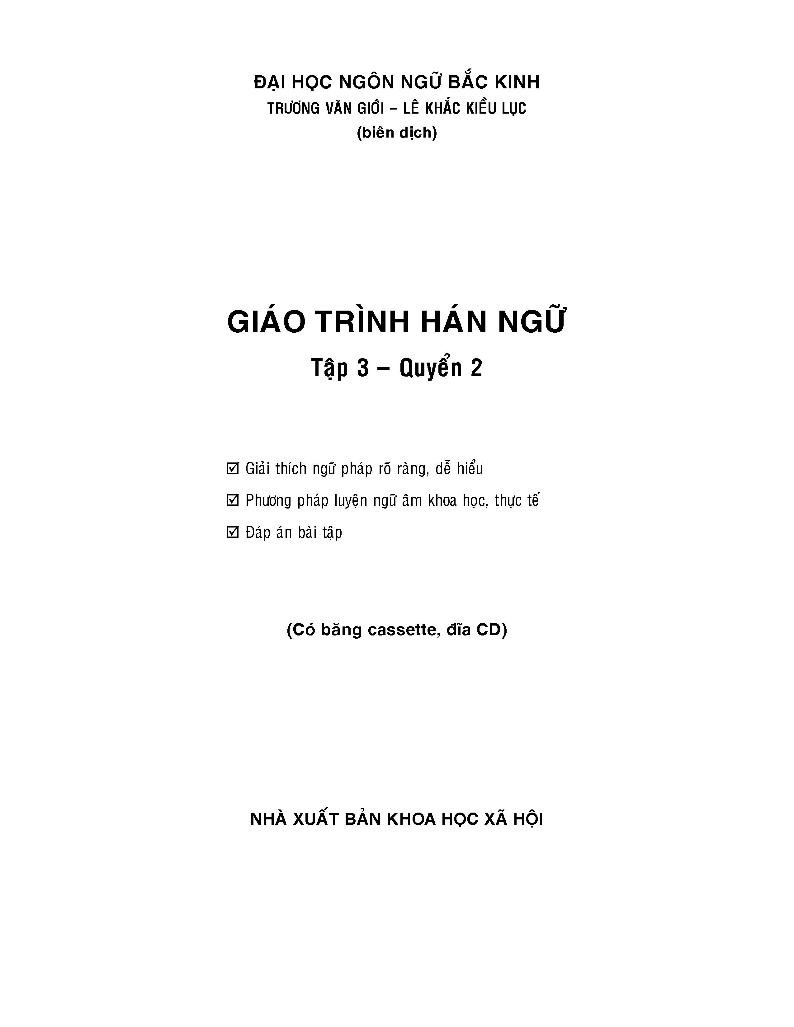 Giáo Trình Hán Ngữ 6 - Tập 3 - Quyển Hạ (Phiên Bản 3) Nếu coi Giáo trình Hán ngữ quyển 1, và Giáo trình Hán ngữ Quyển 2 là Giáo trình tiếng Trung sơ cấp; Thì Giáo trình Hán ngữ quyển 3, 4 là Giáo trình tiếng Trung trung cấp thì tới Giáo trình Hán ngữ quyển 5, 6 là giáo trình tiếng Trung cao cấp. Đây là quyển cuối trong bộ sách Giáo trình Hán Ngữ. Học hết quyển này thì bạn có thể thoải mái nói chuyện tiếng Trung, viết các đoạn văn khá tốt. Bạn cũng sẽ dễ dàng thi HSK 5 hơn. Tầm này thì đi xin việc cũng chả còn đáng lo nữa. Nếu bạn chăm chỉ thì còn có thể phiên dịch tốt ý chứ. Giáo trình Hán ngữ 6 – Tập 3 – Quyển hạ – Phiên bản 3 mới nhất là cuốn sách được biên soạn kỹ lưỡng từ bộ giáo trình cũ. Bên cạnh những kiến thức cũ thì hiện nay cuốn giáo trình đã được biên soạn lại bổ sung rất nhiều kiến thức. Với lượng từ mới khổng lồ cuốn sách sẽ hứa hẹn mang đến cho các bạn một trải nghiệm vô cùng thú vị với tiếng Trung