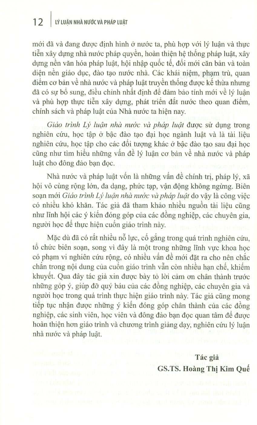 Nhận thức được rõ ràng yêu cầu này, tác giả Hoàng Thị Kim Quế đã biên soạn Giáo trình Lý luận nhà nước và pháp luật, dựa trên sự tập hợp, kế thừa, phát triển những kết quả nghiên cứu của khoa học lý luận nhà nước và pháp luật trong nước và đặc biệt là quốc tế; đồng thời lĩnh hội, bổ sung nhiều cách tiếp cận mới đã và đang được định hình ở nước ta.