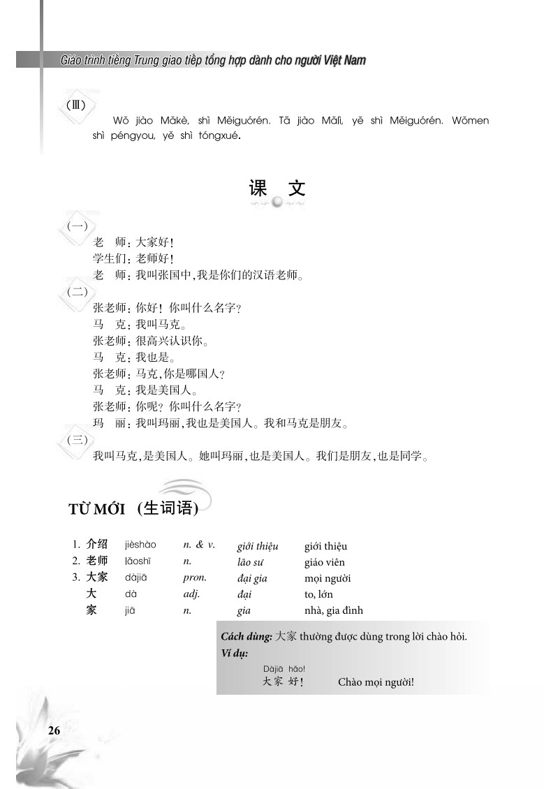 Giáo trình tiếng Trung Giao tiếp tổng hợp dành cho người Việt Nam Cuốn sách Giáo Trình Tiếng Trung Giao Tiếp Tổng Hợp Dành Cho Người Việt Nam có 15 bài, mỗi bài gồm: