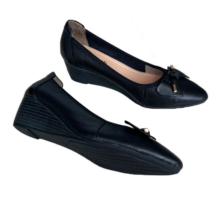 - Giày nữ mũi nhọn Đế Xuồng 5cm Da Bò đính nơ xinh xắn Màu Đen Trường Hải DX117Đ Hàng gia công đường may chắc chắn, Dáng form ôm gọn đôi chân