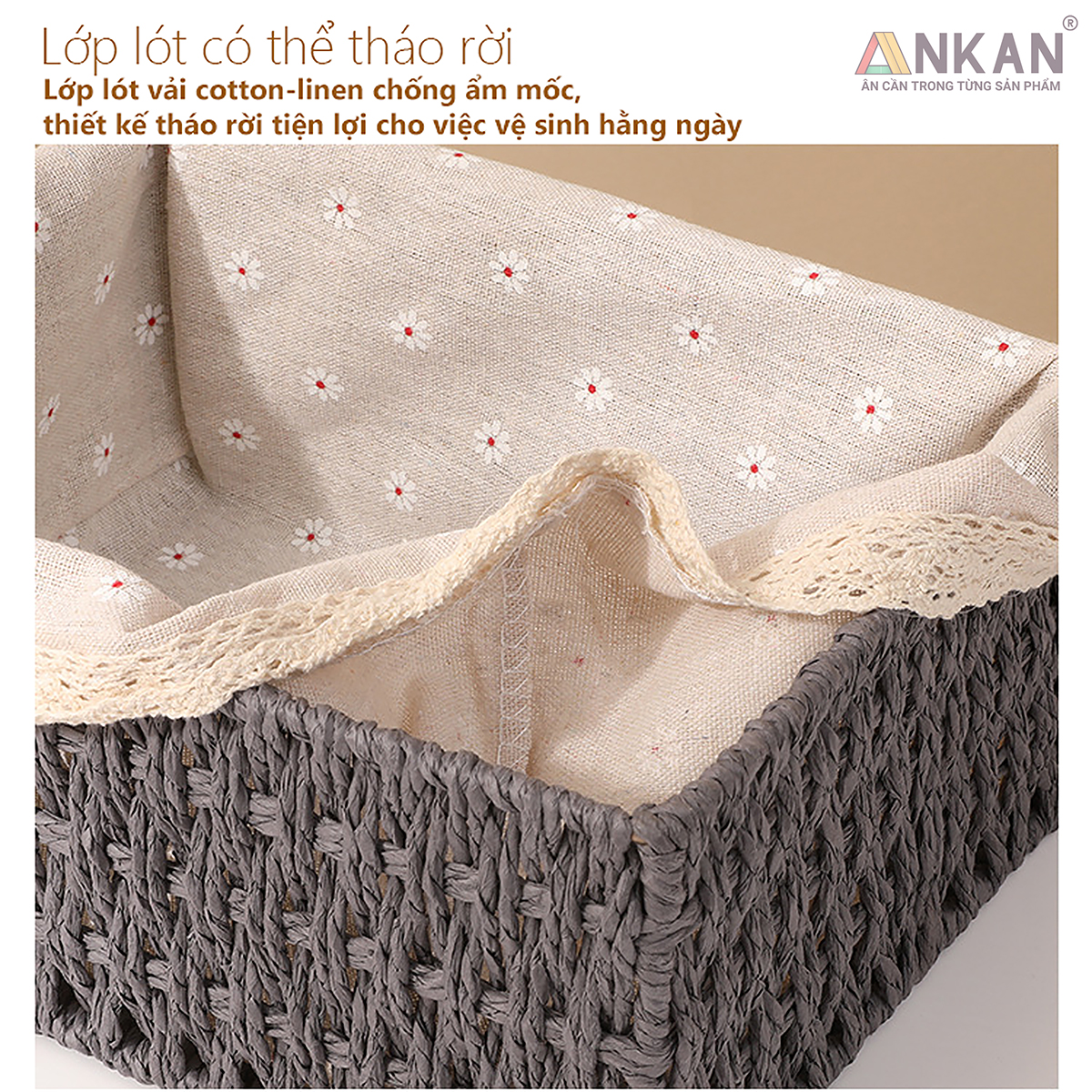 - Vật liệu kim loại chắc chắn được sử dụng làm khung ngoài cho giỏ mây, kết hợp với lớp lót bằng canvas với hoa văn vintage, có thể tháo rời để dễ dàng vệ sinh.