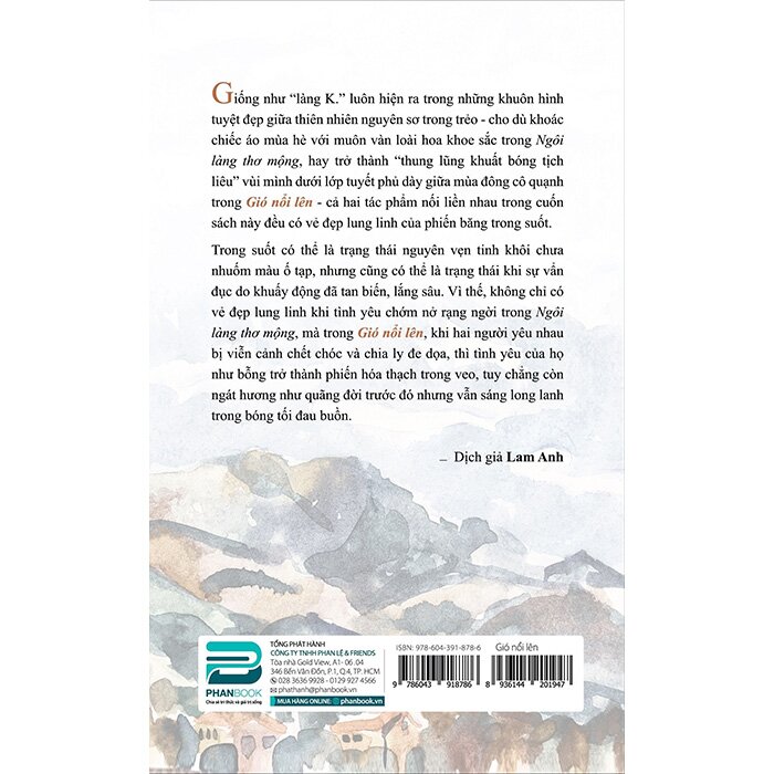 Giống như “làng K.” luôn hiện ra trong những khuôn hình tuyệt đẹp giữa thiên nhiên nguyên sơ trong trẻo - cho dù khoác chiếc áo mùa hè với muôn vàn loài hoa khoe sắc trong Ngôi làng thơ mộng, hay trở thành “thung lũng khuất bóng tịch liêu” vùi mình dưới lớp tuyết phủ dày giữa mùa đông cô quạnh trong Gió nổi lên - cả hai tác phẩm nối liền nhau trong cuốn sách này đều có vẻ đẹp lung linh của phiến băng trong suốt.