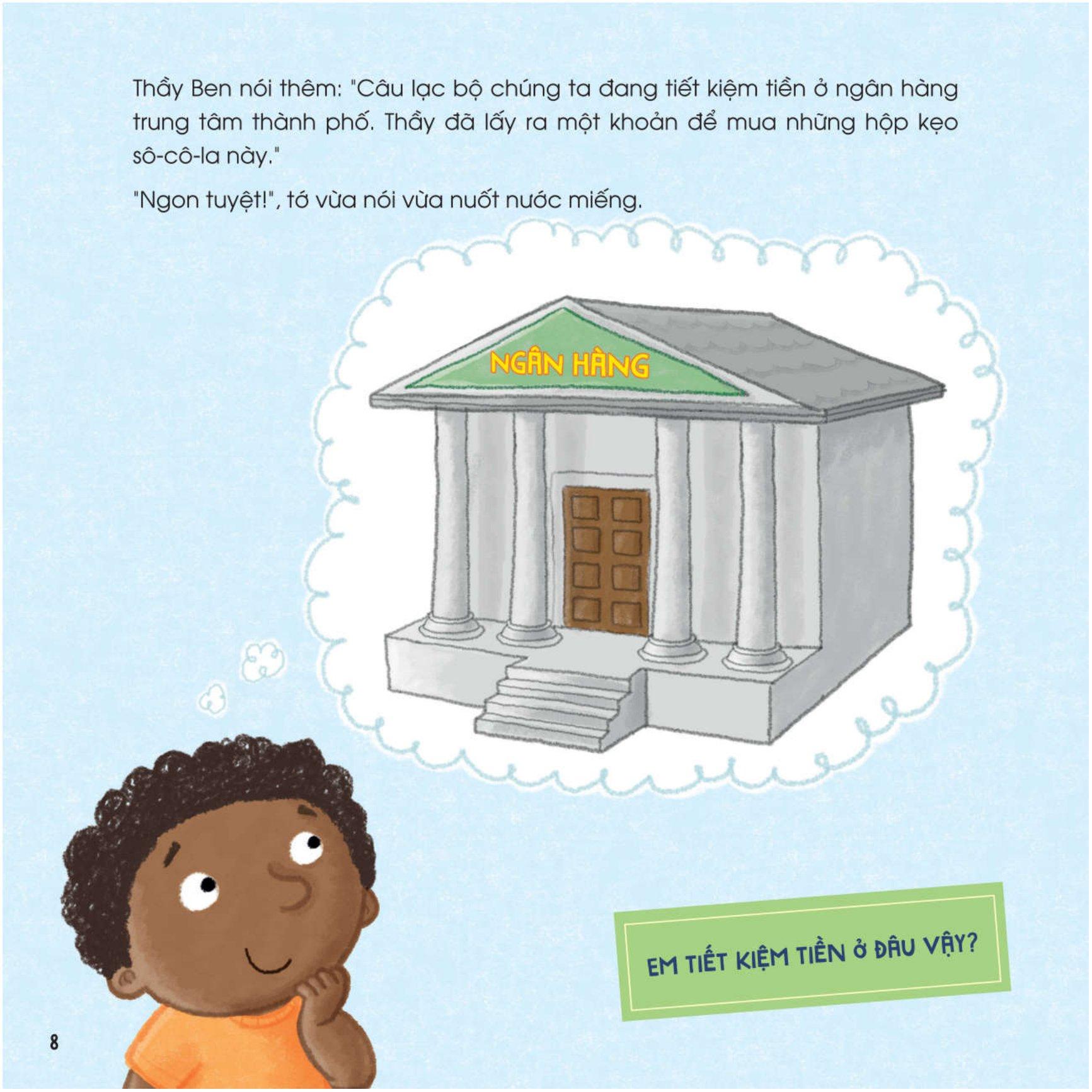 Thật vậy, với 06 cuốn sách truyện cùng những nhân vật sinh động trong các tình huống đời thường quen thuộc của bộ sách này, trẻ sẽ được làm quen với những kiến thức căn bản nhất về tiền như: Chi phí, thu nhập, tiết kiệm, mua sắm, theo dõi thu chi, cân nhắc đưa ra lựa chọn giữa nhu cầu và mong muốn,…