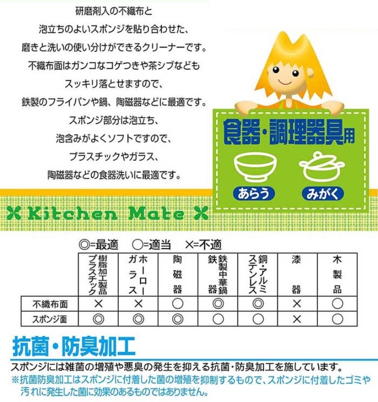 • Bề mặt thô nhám … giúp làm sạch được tất cả các loại vật dụng trong gia đình như: xoong, nồi, ấm chảo bằng nhôm, thép, inox hay các loại vật dụng bàn ăn như ly/ cốc, bát/ chén có chất liệu bằng sành sứ, thủy tinh...vv.