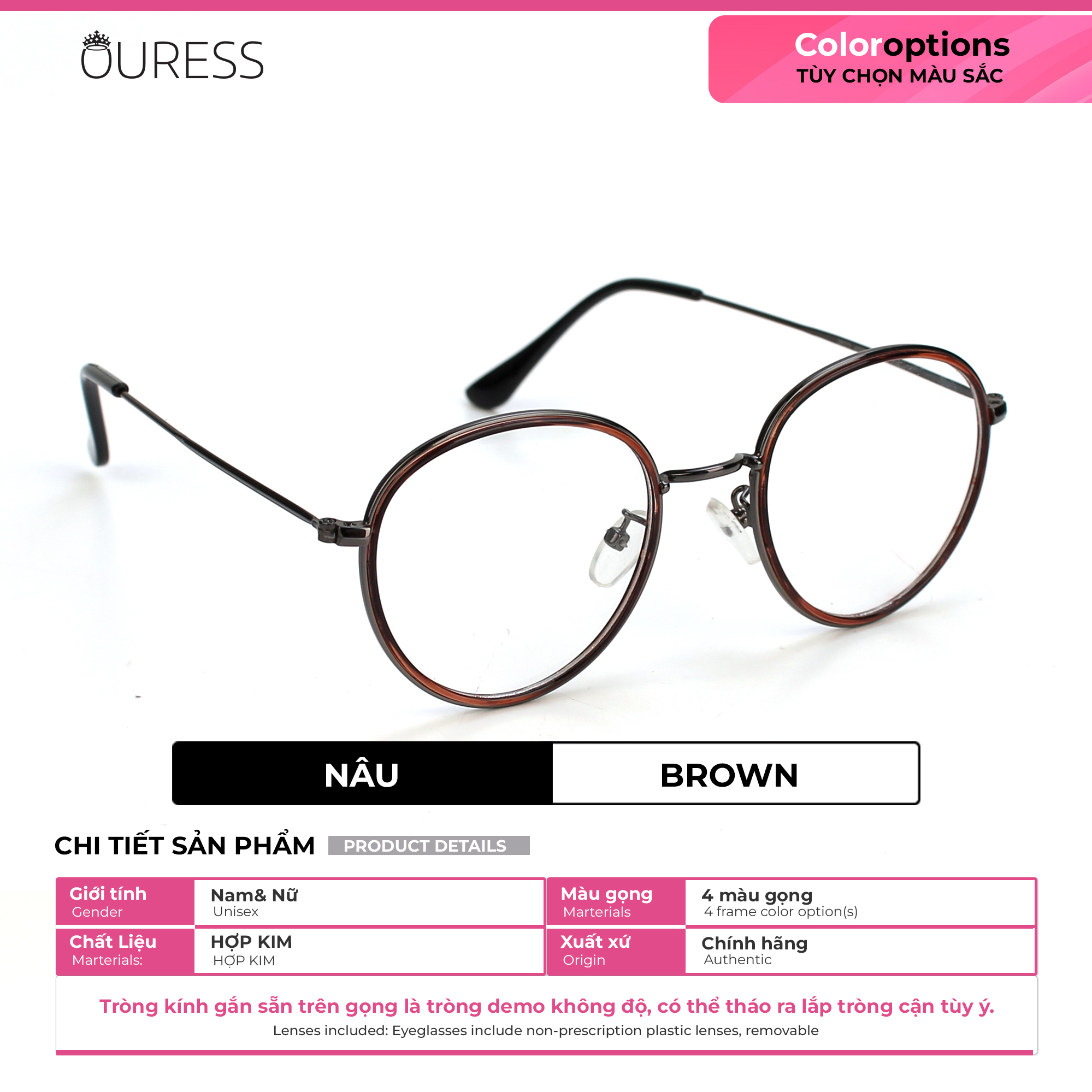 GỌNG KÍNH CẬN HỢP KIM NAM NỮ THỜI TRANG - OURESS ------------------------- Chất liệu : gọng hợp kim kết hợp càng kính hợp kim --------------------------- Gọng hợp kim rất được ưa chuộng và được các