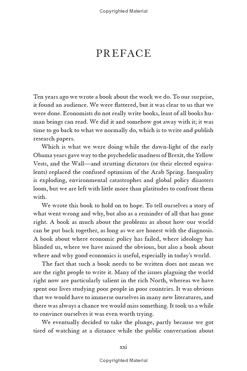 In this ambitious, provocative book Abhijit V. Banerjee and Esther Duflo show how traditional western-centric thinking has failed to explain what is happening to people in a newly globalized world: in short Good Economics has been done badly. This precise but accessible book covers many of the most essential issues of our day--including migration, unemployment, growth, free trade, political polarization, and welfare. Banerjee and Duflo will confound and clarify the presumptions of our times, such as: