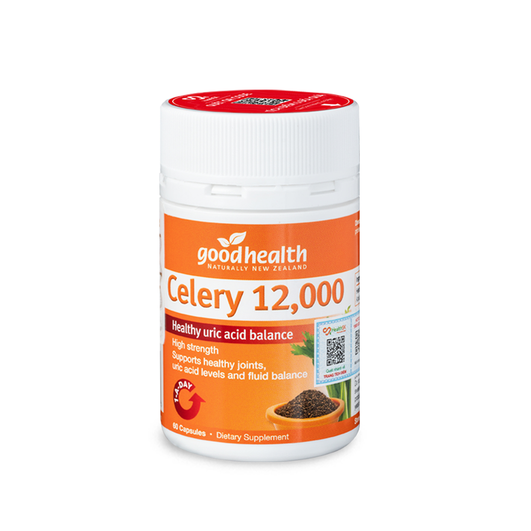 - Hỗ trợ giảm đau và giảm viêm khớp do gout CÔNG DỤNG Thực phẩm BVSK Goodhealth Celery 12,000 – Hạt Cần Tây hỗ trợ Gout – chứa hàm lượng hạt cần tây cao – đây là loại dược liệu truyền thống giúp hỗ trợ triệu chứng bệnh gout và cân bằng acid uric trong cơ thể, hỗ trợ đường tiết niệu và dịch cơ thể. THÀNH PHẦN Thành phần trong 1 viên nang cứng Goodhealth Celery Chiết xuất hạt cần tây – Tương đương với hạt cần tây khô 12,000 mg ĐỐI TƯỢNG SỬ DỤNG