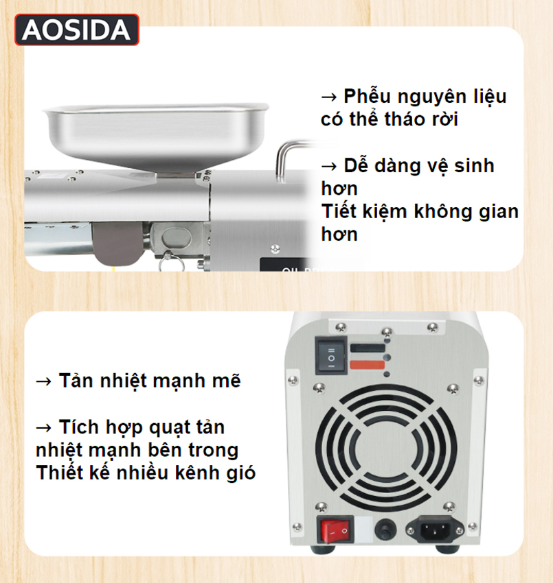 - Vấn đề sức khỏe hiện nay đang rơi vào tình trạng đáng báo động khi, các chủ cơ sở sản xuất, hộ kinh doanh dầu ăn chỉ chạy theo lợi nhuận mà bất chấp cung cấp ra thị trường các loại dầu ăn giả, kém chất lượng, gây tổn hại đến sức khỏe và tính mạng người tiêu dùng. Cách tốt nhất bảo vệ bản thân và mọi người trong gia đình đó chính là tự ép dầu thực vật ngay tại nhà. Giới thiệu máy ép dầu thực vật nóng và lạnh dùng trong gia đình Aosida 999A là dòng sản phẩm nâng cấp từ mã 888A với công suất và chất lượng vượt trội như: Công suất cao, màn hình điện tử dễ dàng thao tác, buồng ép lớn cho ra dầu trong hơn, ép nóng và lạnh, hoạt động liên tục 24h.... [ƯU ĐIỂM]
