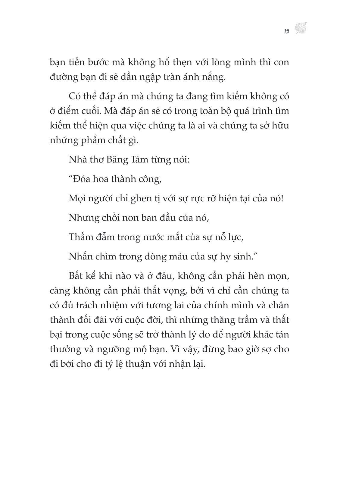 - “Đóa hoa thành công, Mọi người chỉ ghen tị với sự rực rỡ hiện tại của nó! Nhưng chồi non ban đầu của nó, thấm đẫm trong nước mắt của sự nỗ lực, nhấn chìm trong dòng máu của sự hi sinh.”