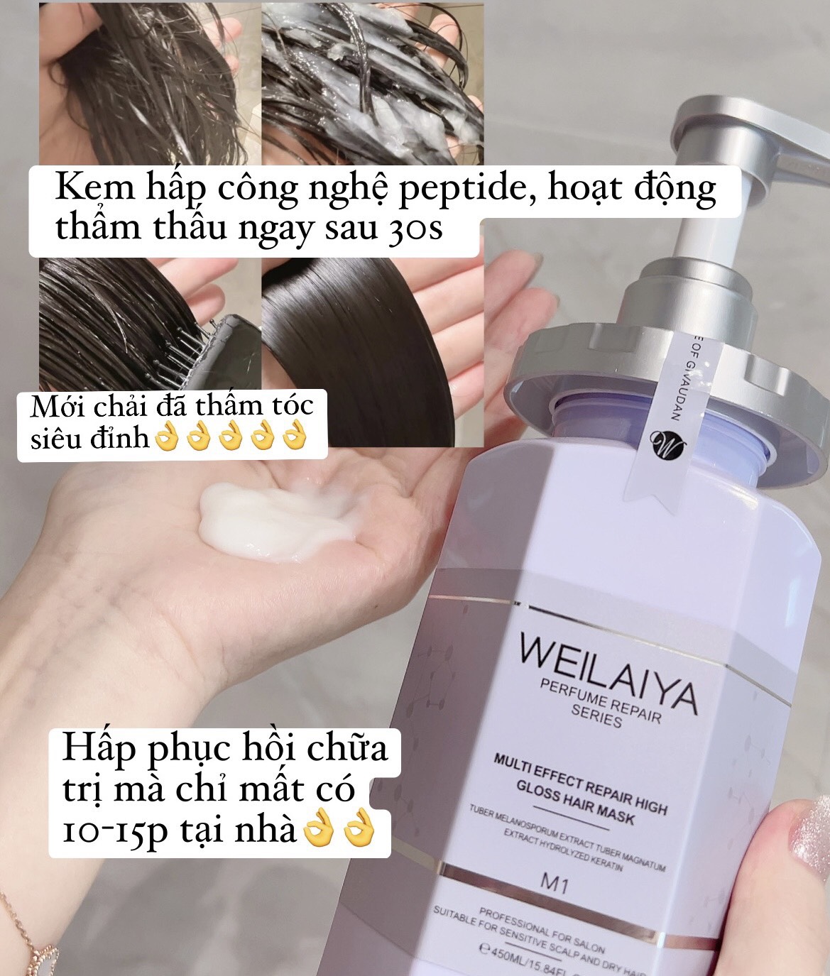 - 7 loại dầu gốc (base oil ) thực vật —Năng lượng tinh túy, rạng ngời tỏa sáng. Ưu điểm của Dầu hấp phục hồi liên kết tóc Weilaiya: Mất ít thời gian hơn và có thể nhanh chóng hấp thụ chỉ trong 30s, làm quá trình 1 lần hấp tóc là 10-15p Dễ dàng gội sạch, không để lại cặn trên tóc, tóc được thông thoáng dễ chịu, vì dầu hấp dạng peptide Mùi hương sang chảnh nước hoa, hương thơm rất trend. Ngày hôm sau, tóc vẫn mềm và bóng, bồng bềnh tự nhiên, k dính bết cảm nhận độ dầy sợi rõ nét. Nhiều thành phần quý hiếm chăm sóc sang trọng dịu nhẹ cho mái tóc như: Gấp đôi Nấm truffle trắng - đen, 8 đầu dưỡng cao cấp... Đo lường hiệu quả của Dầu hấp phục hồi liên kết tóc Weilaiya: 1 lần cảm nhận hiệu quả rõ rệt sau 1 lần sử dụng 21 lần duy trì sử dụng liên tục 21 lần, chất tóc cải thiện rõ rệt +170% sự dẻo dai, chắc khỏe +78% độ mượt +500% độ bóng +89% độ ẩm