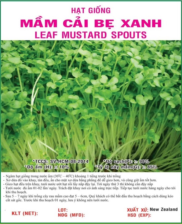 - Năng suất: 350-400g rau/50g hạt Kỹ thuật trồng: NGÂM - Ủ HẠT GIỐNG: Nước ngâm hạt giống pha theo công thức 02 sôi - 3 lạnh, Lượng nước ngập gấp 1 lần hạt giống, Thời gian ngâm từ 3- 6giờ ( Tuỳ theo loại hạt giống: loại dày võ ngâm lâu, mỏng võ ngâm ít). Rửa hạt với nước lạnh, trộn đều khi rửa (làm sạch hạt giống). Vớt hạt giống ra, chuẩn bị ủ hạt. Ủ hạt trong vải sạch, trùm kín, đặt bao ủ hạt vào rổ nhựa để tránh bị đọng nước, đặt rổ nhựa ủ hạt nơi thoáng mát, luôn luôn giữ độ ẩm cho bao ủ. Thời gian ủ trung bình 12giờ. Kết thúc quá trình ngâm ủ hạt giống. Chúng ta nhận thấy các hạt giống đã nức nanh GIEO HẠT: Khay phải sạch, khô. Cho giá thể vào khay (dày khoảng 2-3cm), cào cho bằng phẳng mặt khay. tưới phun sương cho ướt (ẩm) giá thể. Gieo đều hạt giống lên trên, tưới phun sương cho ướt hạt giống và giá thể Ủ KHAY: Khay ủ phải ẩm để hạt có điều kiện nãy mầm. sử dụng giấy báo hoặc vật cứng đậy lên mặt khay (ngăn ánh sáng đến hạt giống) .Tưới phun sương khi thấy giá thể bi khô (có thể tưới sáng, trưa, chiều) CHĂM SÓC RAU: Khi hạt giống đã nảy mầm và cao bằng bề mặt khay. Bỏ dụng cụ đậy khay ra. vẫn để khay trong bóng tôi ( không nên có ánh sáng trực tiếp). Tưới phun sương hàng ngày ( giữ độ ẩm cho giá thể). Khi thấy đã phát triển được 4-5cm thì đưa khay rau ra khu vực có ánh sáng để rau xanh và mập thân. THU HOẠCH- BẢO QUẢN:- Sau 5 đến 7 ngày trồng, rau mầm cao 8 - 12cm là thu hoạch. Cách thu hoạch: Dùng kéo hoặc dao (Loại dao dùng để rọc giấy) cắt sát bề mặt giá thể. Bảo quản: Rữa sạch các vỏ hạt giống còn dính trên thân rau. Để kho và cho vào tủ lạnh .