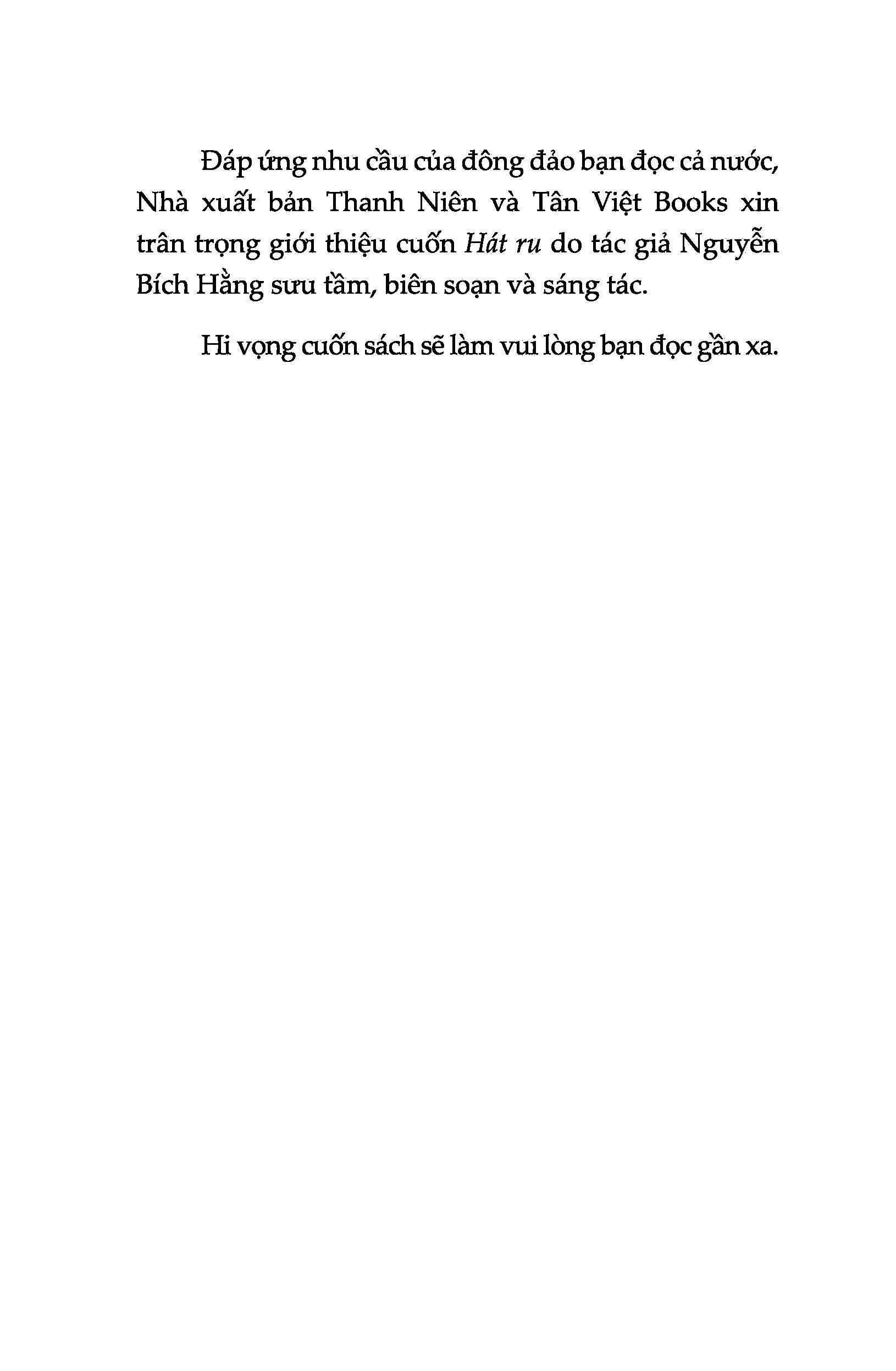 Đáp ứng nhu cầu của đông đảo bạn đọc trong cả nước, Tân Việt Books liên kết Nhà xuất bản Thanh Niên giới thiệu đến dộc giả cuốn Hát ru – Tập hợp những câu hát thấm đượm tình quê hương do tác giả Nguyễn Bích Hằng sưu tầm, biên soạn và sáng tác.