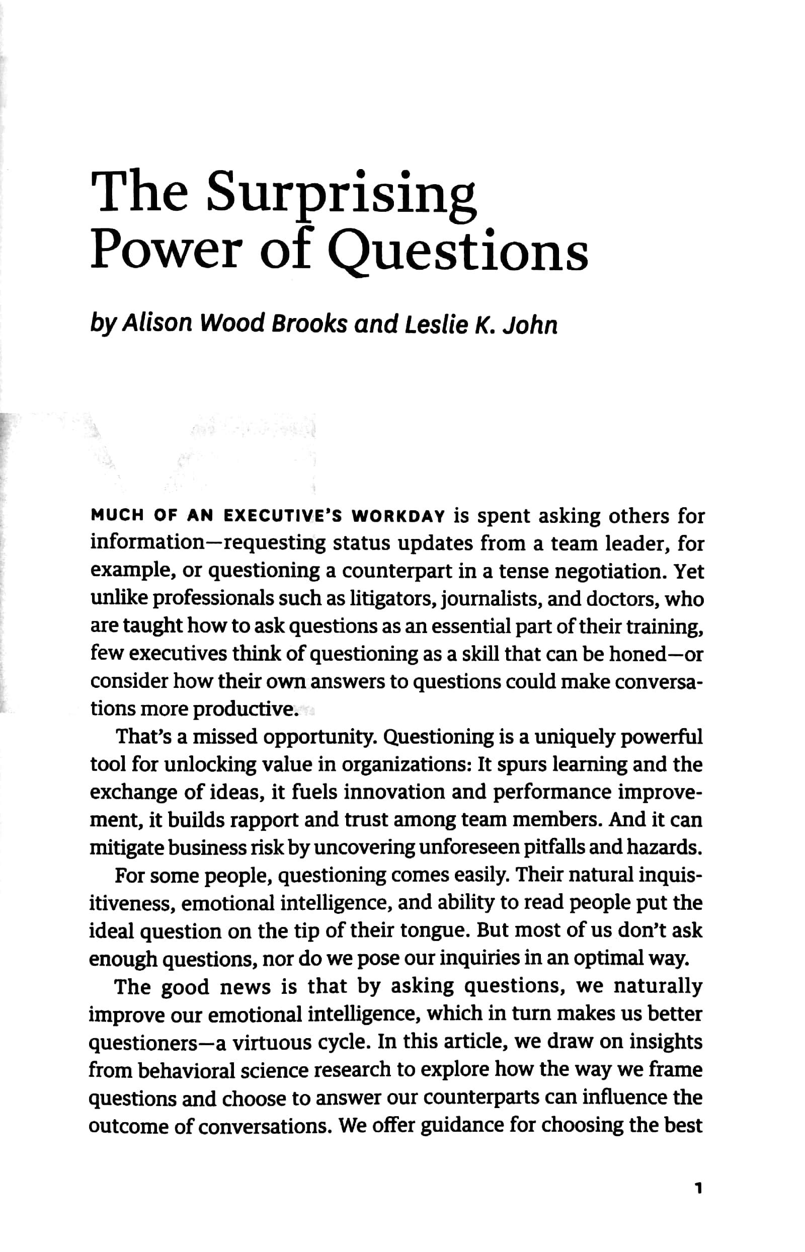This collection of articles includes "The Surprising Power of Questions," by Alison Wood Brooks and Leslie K. John; "Strategy Needs Creativity," by Adam Brandenburger; "What Most People Get Wrong about Men and Women," by Catherine H. Tinsley and Robin J. Ely; "Collaborative Intelligence: Humans and AI Are Joining Forces," by H. James Wilson and Paul R. Daugherty; "Stitch Fix's CEO on Selling Personal Style to the Mass Market," by Katrina Lake; "Strategy for Start-Ups," by Joshua Gans, Erin L. Scott, and Scott Stern; "Agile at Scale," by Darrell K. Rigby, Jeff Sutherland, and Andy Noble; "Operational Transparency," by Ryan W. Buell; "The Dual-Purpose Playbook," by Julie Battilana, Anne-Claire Pache, Metin Sengul, and Marissa Kimsey; "How CEOs Manage Time," by Michael E. Porter and Nitin Nohria; and "When No One Retires," by Paul Irving.