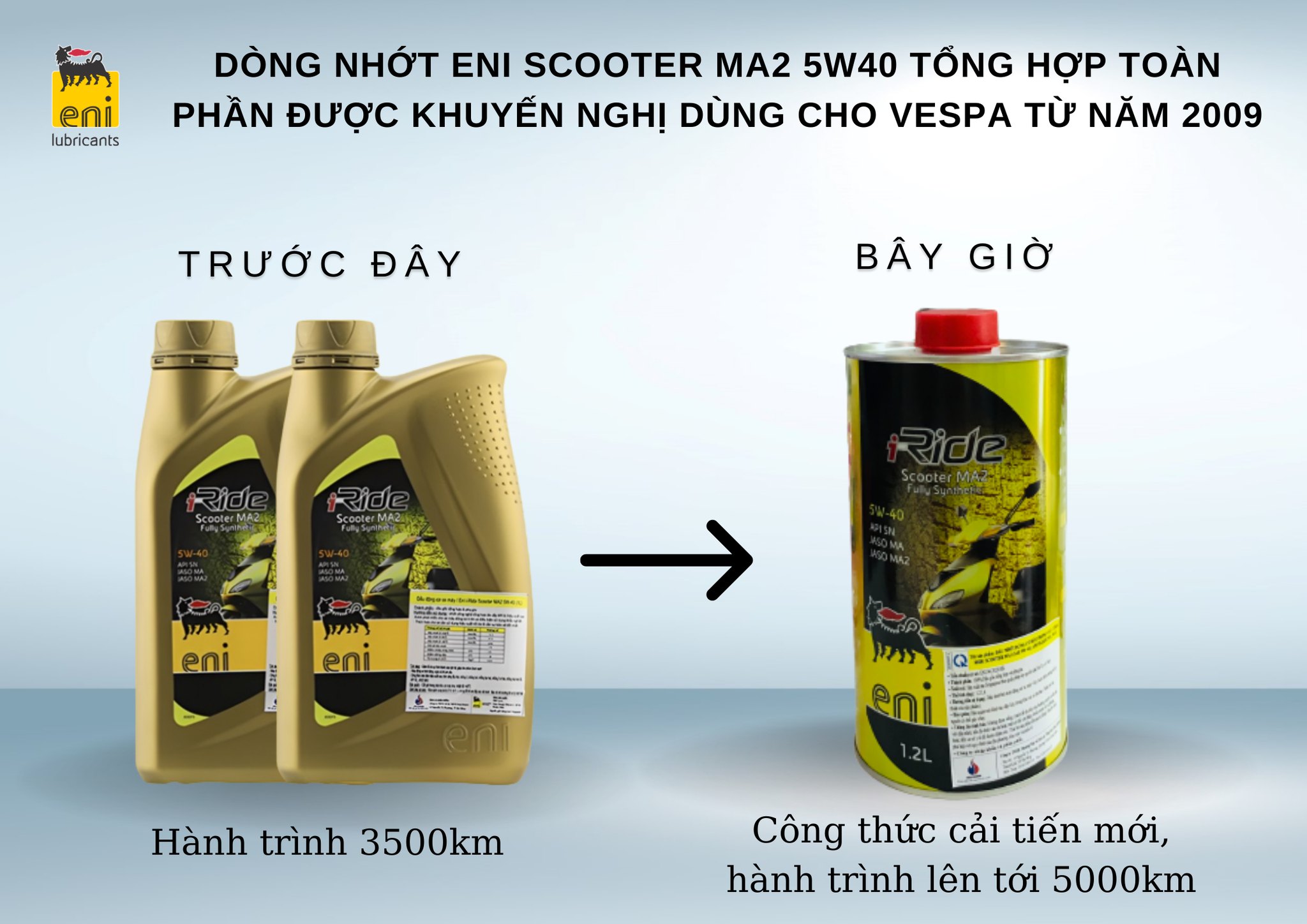 ENI I-RIDE SCOOTER MA2 5W-40 là dầu nhớt bôi trơn tích hợp sự đổi mới trong công nghệ pha chế từ nghiên cứu của các chuyên gia Eni trong lĩnh vực dầu nhờn). Tính chất . Cấp nhớt: JASO MA, MA2 | API SN . Phân loại: Nhớt tổng hợp toàn phần (Fully Synthetic) Đặc tính . Khả năng bôi trơn vượt trội, chống mài mòn hiệu quả. . Khả năng làm sạch động cơ, không để lại cặn bẩn trong khoang máy. . Khả năng chịu được nhiệt độ cao mà không làm giảm công suất. . Khả năng tăng tốc cực nhạy, đáp ứng mọi tình huống. . Chống oxy hóa cao, đảm bảo tuổi thọ của động cơ. . Tiết kiệm nhiên liệu và bảo vệ môi trường. Ứng dụng . Sử dụng được cho hầu hết các loại xe: xe ga và xe số động cơ 4 thì. . Khuyến khích cho các dòng xe có hiệu suất cao. . Được đề xuất sử dụng cho hãng xe Vespa của Piaggio.