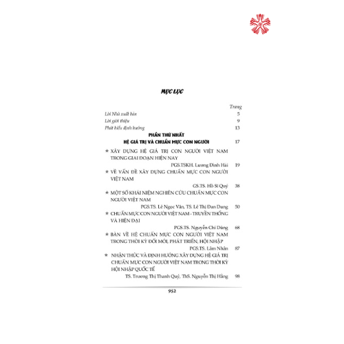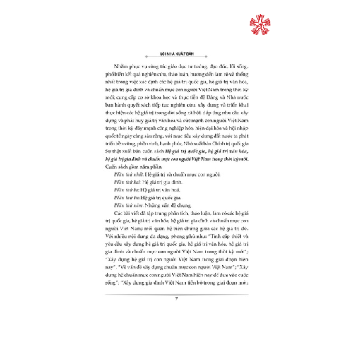 Nội dung cuốn sách Hệ giá trị quốc gia, hệ giá trị văn hóa, hệ giá trị gia đình và chuẩn mực con người Việt Nam trong thời kỳ mới gồm năm phần: