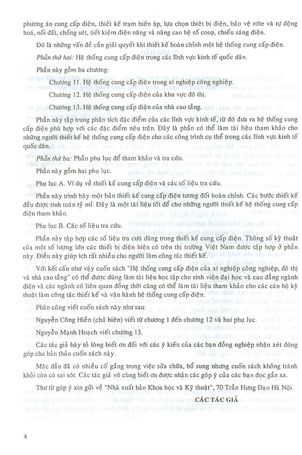 Hệ Thống Cung Cấp Điện Của Xí Nghiệp Công Nghiệp Đô Thị Và Nhà Cao Tầng gồm 3 phần chính: Phần thứ nhất: Nguyên lý cơ bản của hệ thống cung cấp điện. Chương 1: Những vấn đề chung về cung cấp điện. Chương 2: Phương pháp tính toán kinh tế - kỹ thuật trong thiết kế cung cấp điện. Chương 3: Xác định phụ tải điện. Chương 4: Lựa chọn phương pháp cung cấp điện. Chương 5: Trạm biến áp. Chương 6: Lựa chọn các thiết bị điện trong hệ thống cung cấp điện. Chương 7: Bảo vệ rơle và tự động hóa trong hệ thống cung cấp điện. Chương 8: Nối đất và chống sét. Chương 9: Tiết kiệm điện năng và nâng cao hệ số công suất cosφ. Chương 10: Chiếu sáng công nghiệp. Phần thứ hai: Hệ thống cung cấp điện trong các lĩnh vực kinh tế quốc dân. Chương 11: Hệ thống cung cấp điện trong xí nghiệp công nghiệp. Chương 12: Hệ thống cung cấp điện trong các khu vực đô thị. Chương 13: Hệ thống cung cấp điện của nhà cao tầng. Phần thứ ba: Ví dụ về thiết kế cung cấp điện và các số liệu tra cứu. Phụ lục A: Thiết kế hệ thống cung cấp điện. Phụ lục B: Các số liệu tra cứu.