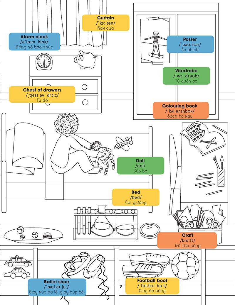 Những bức tranh sinh động trong cuốn sách này giúp em tập trung vào phần từ mới, trong khi điểm tô thêm màu sắc cho những sự vật trong tranh đấy. Còn gì tuyệt vời hơn khi vừa được trau dồi vốn từ vựng tiếng Anh, vừa được thỏa sức sáng tạo với những màu sắc! Để tìm hiểu thêm về cách phát âm của các từ vựng trong sách, em hãy tham khảo thêm hai cuốn Tiếng Anh cho người mới học và Từ điển tiếng Anh bằng hình cùng bộ nhé!