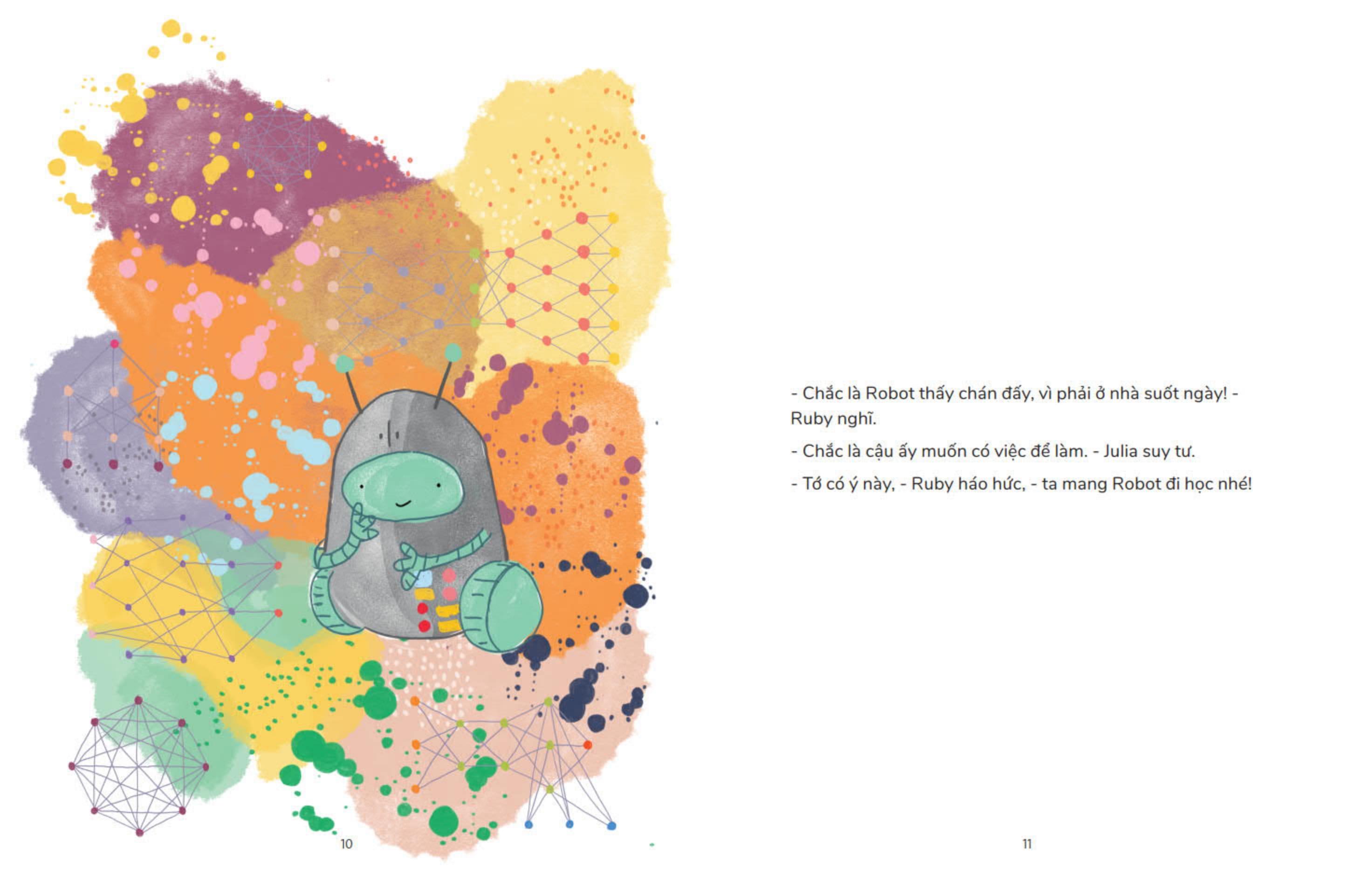 Hello Ruby - Ngày Đầu Đến Trường Của Robot Trí tuệ nhân tạo (Artificial Intelligence – AI) đã và đang vận hành trong cuộc sống chúng ta. Thế hệ trẻ em ngày nay lớn lên trong một thế giới nơi máy tính có thể lắng nghe, hồi đáp, giới thiệu, dự đoán, và học những điều mới nhanh chóng. Nếu vậy, làm sao để phân biệt con người và robot? Liệu robot có cảm xúc như chúng ta hay không? Mang đến câu chuyện rung động về tình bạn giữa Ruby và những người bạn (con người) với robot cùng hàng loạt hoạt động tương tác phá cách, mới lạ, Hello Ruby – Ngày Đầu Đến Trường Của Robot sẽ lần lượt so sánh những điểm giống và khác nhau trong cách cư xử, học tập của con người và robot. Mời các bạn nhỏ khám phá thế giới robot và trí tuệ nhân tạo với Ruby nhé!
