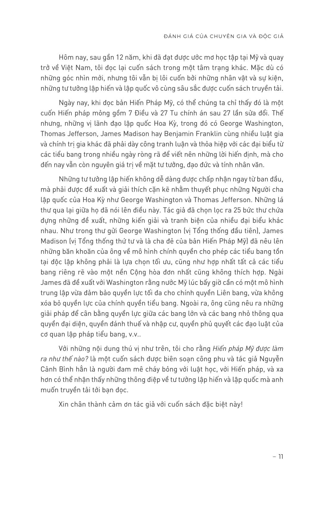 “Hiến pháp Mỹ được làm ra như thế nào?” đã cung cấp một bức tranh toàn cảnh về sự ra đời của Hiến pháp Mỹ, như một lời lý giải cho rất nhiều người có cùng mối băn khoăn. Vậy Hiến pháp Mỹ đã được làm ra như thế nào? Nó được làm ra trong những cuộc tranh luận nảy lửa tưởng như không có lối thoát và những mối bất đồng sâu sắc, bởi những bộ óc vĩ đại có một không hai trong lịch sử, và bằng một tinh thần mà người ta khó có thể tìm một tính từ nào thay thế ngoài cách gọi - “tinh thần Mỹ”. Đó là sự tôn trọng đặc biệt lẫn nhau, thừa nhận những quan điểm hoàn toàn khác biệt, chấp nhận và cùng thỏa hiệp để đi tới lợi ích chung cuối cùng