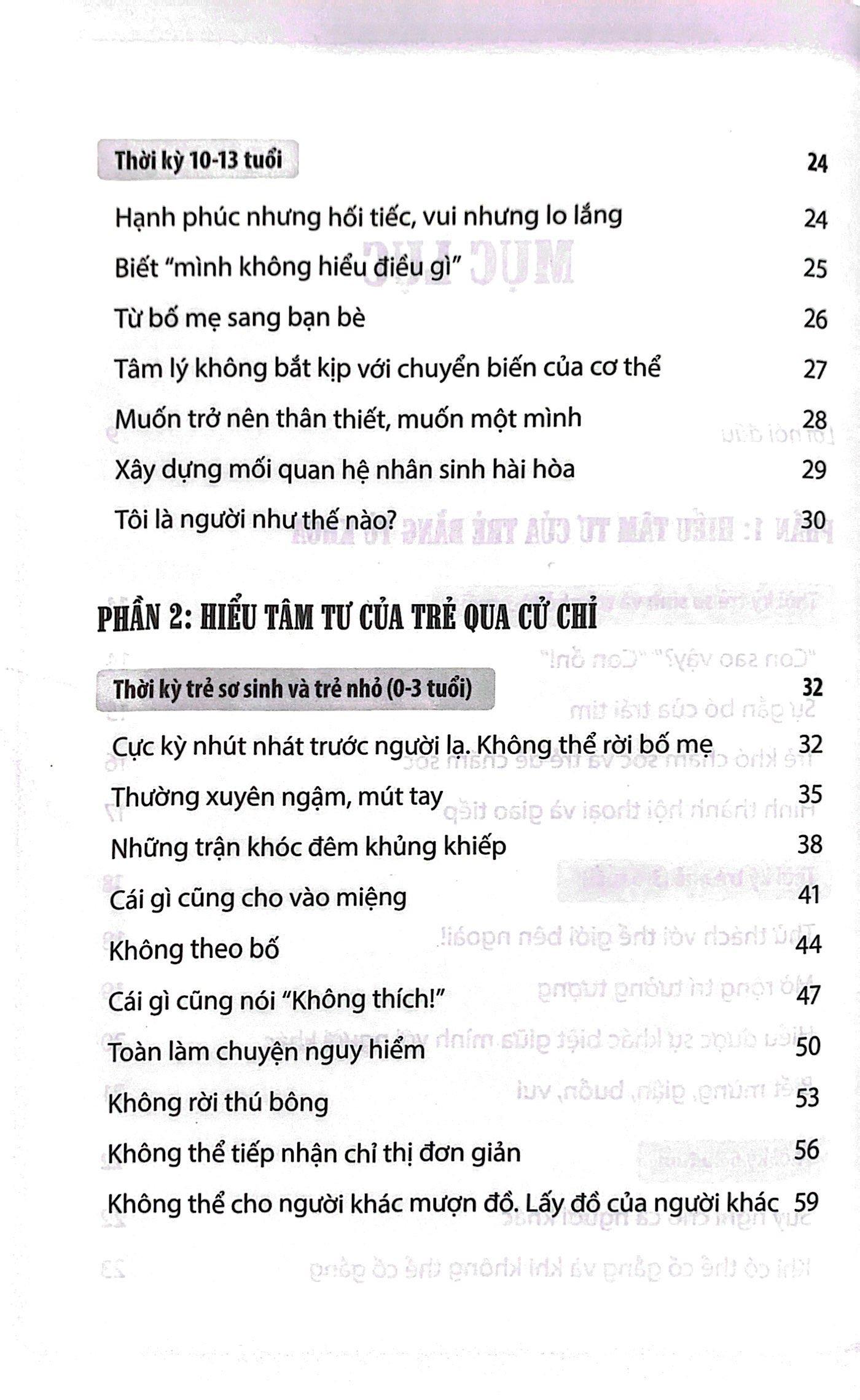 Hiểu tâm tư của trẻ qua cử chỉ gồm hai phần, hiểu tâm tư trẻ bằng từ khóa và hiểu tâm tư trẻ qua cử chỉ. Căn cứ vào những nghiên cứu tâm lý, tác giả đã rút ra những đặc điểm tâm sinh lý của trẻ ở các độ tuổi khác nhau trong khoảng từ 0-13 tuổi. Từ đó, đáp ứng được nhu cầu và có cơ sở để định hướng giáo dục trẻ. Tâm lý học phát triển là ngành khoa học lấy dòng đời con người – từ khi được thụ thai đến lúc qua đời – làm đối tượng để nghiên cứu về sự phát triển tâm lý. Trong cuốn sách này, tác giả đặt khoảng thời gian 13 năm – từ sau sinh đến khoảng thời kỳ dậy thì – làm đối tượng để giải thích bằng “từ khóa”. Mặc dù việc ghi nhớ quá nhiều thứ có vẻ tốn công sức, nhưng trước hết, nếu để tâm vào 17 từ khóa ở Phần 1, bạn có thể tích lũy nhiều trải nghiệm và thốt lên những câu như: “À, ra là vậy!”, “Thảo nào!”, “Con người thật tuyệt!”.