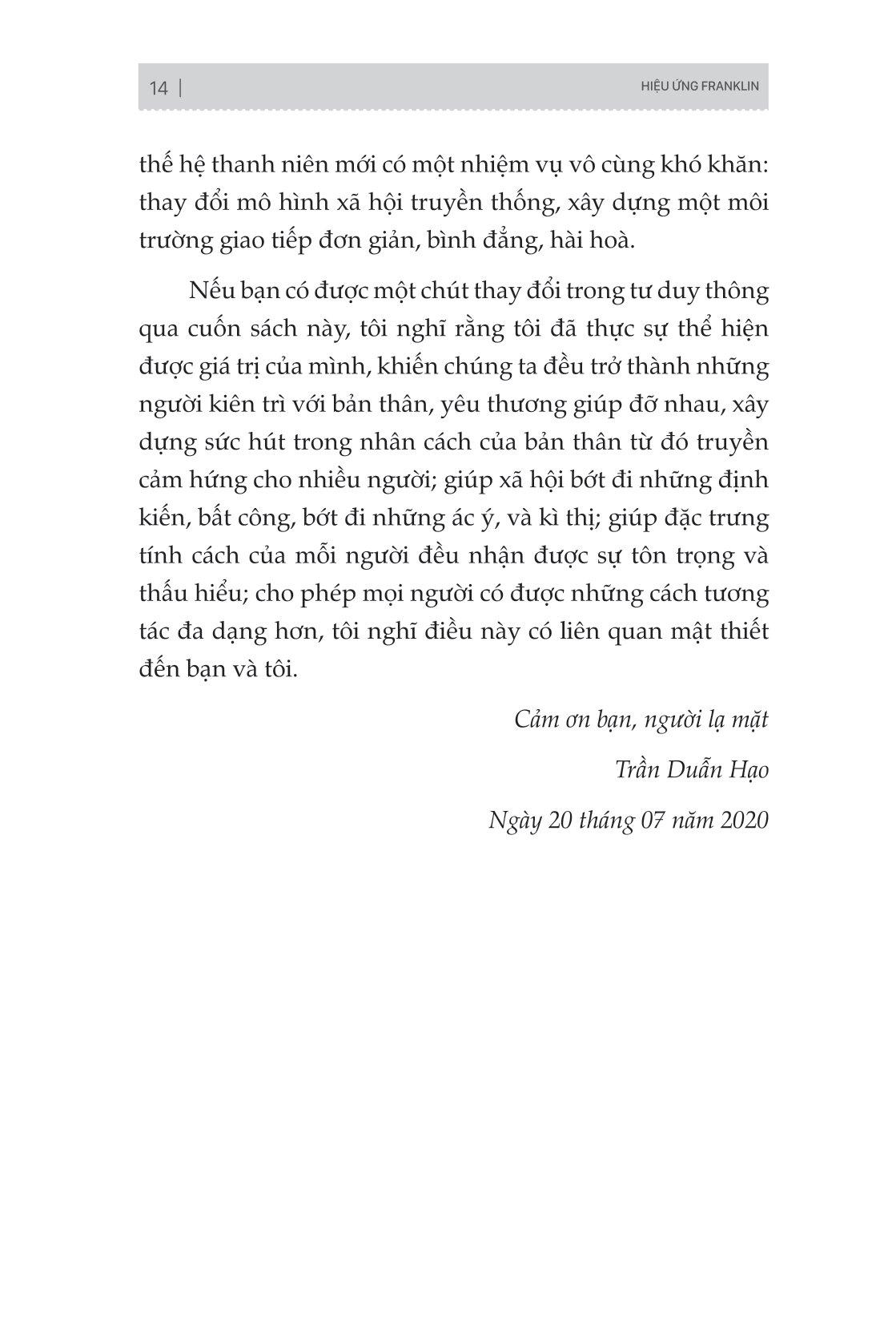 “Hiệu ứng Franklin - Mối quan hệ tốt bắt nguồn từ sự làm phiền” sẽ giúp bạn bước chân vào cuộc sống thực tế thông qua kiến thức tâm lý học phổ thông, dễ hiểu, là một sổ tay về giao tiếp xã hội mà bất kì ai cũng có thể đọc hiểu. Rồi bạn sẽ nhận ra, ngại ngùng khi làm phiền người khác không phải một đức tính tốt, lẩn trốn trong thế giới của bản thân đánh mất liên hệ với thế giới bên ngoài. Mối quan hệ tốt bắt đầu từ chuyện “làm phiền”. Sống ở đời, không thể lúc nào cũng đơn phương độc mã. Biết cách làm phiền người khác là một biểu hiện của EQ cao, cũng là một hình thức khiến đôi bên cảm nhận được sự ấm áp, cảm nhận được giá trị của nhau. Mong tất cả chúng ta đều học được cách mở lòng và nhờ vả người khác một cách đúng đắn.